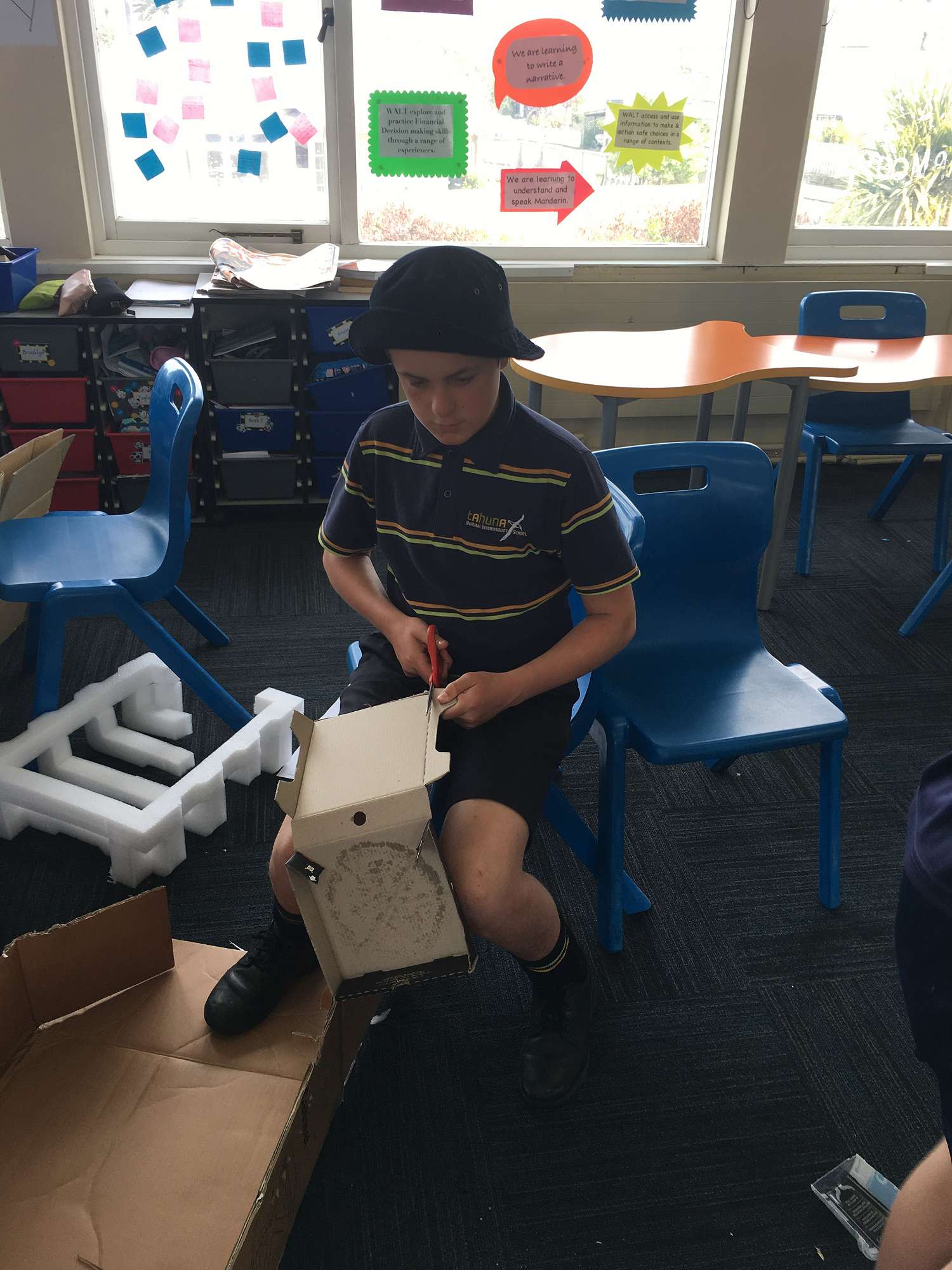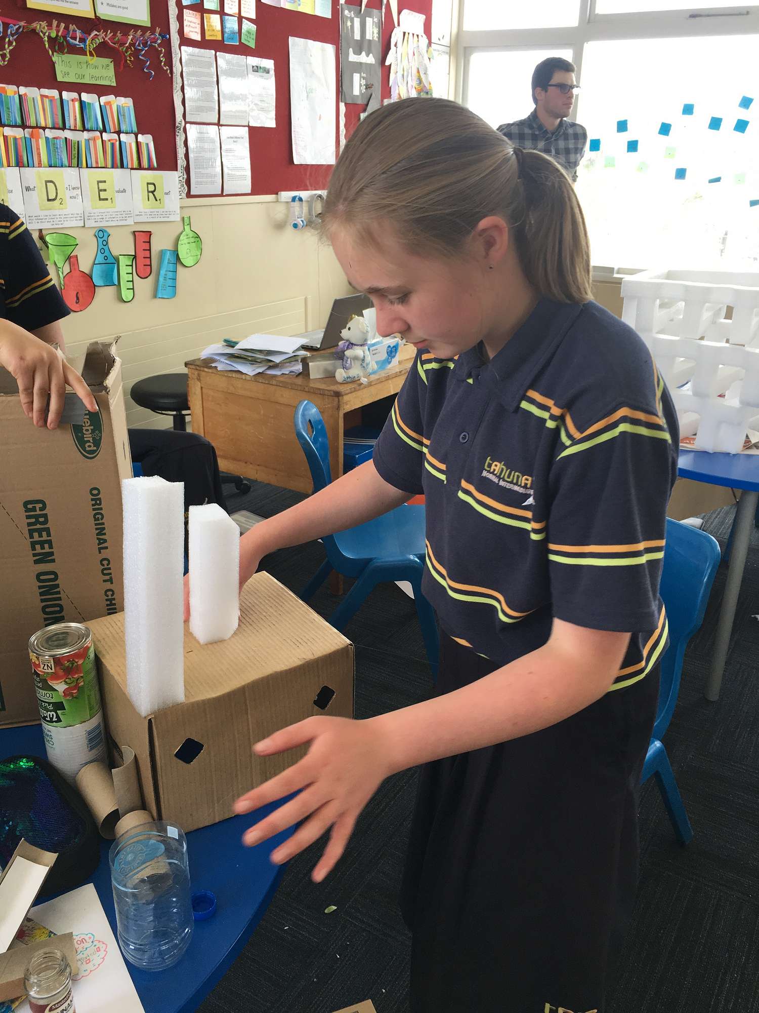 Mr Bardsley, our student teacher, took us for a couple of lessons of technology. Our task was to create marble runs out of recycled materials that we brought from home. We had a variety of different things to use such as cardboard boxes, egg cartons, toilet rolls, yoghurt containers, milk bottles etc. We then had specific challenges to work towards.