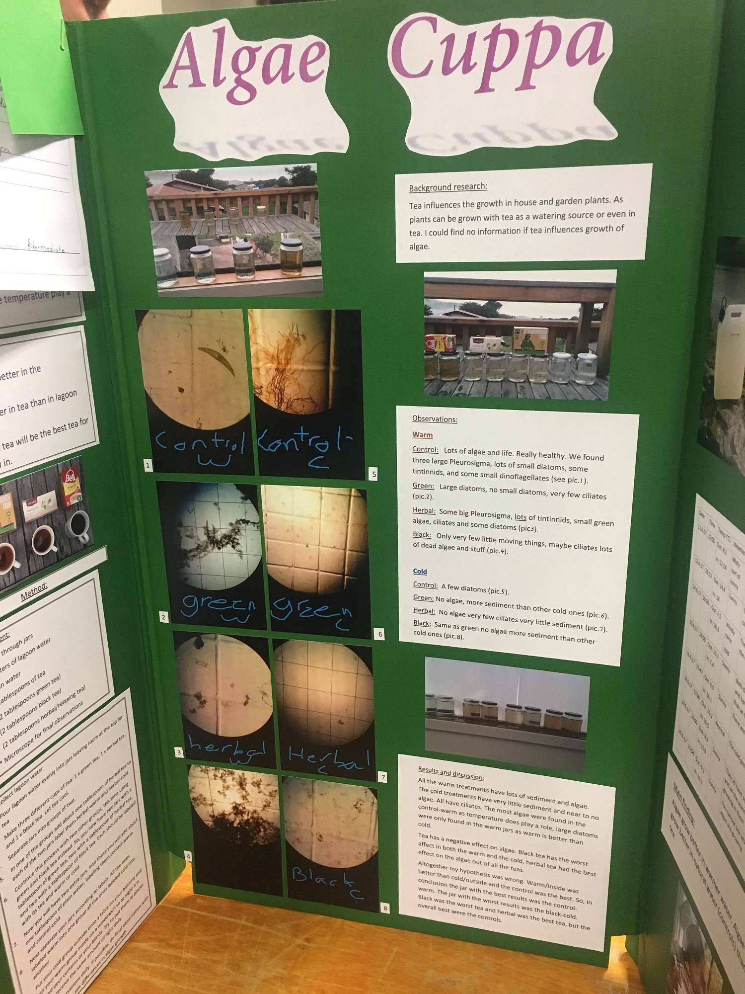 My science fair was called Algae Cuppa., as I wanted to find out if algae grow better in tea than in lagoon water. As a result no, lagoon water is better and so are warmer temperatures but I still grew quite a lot of algae.