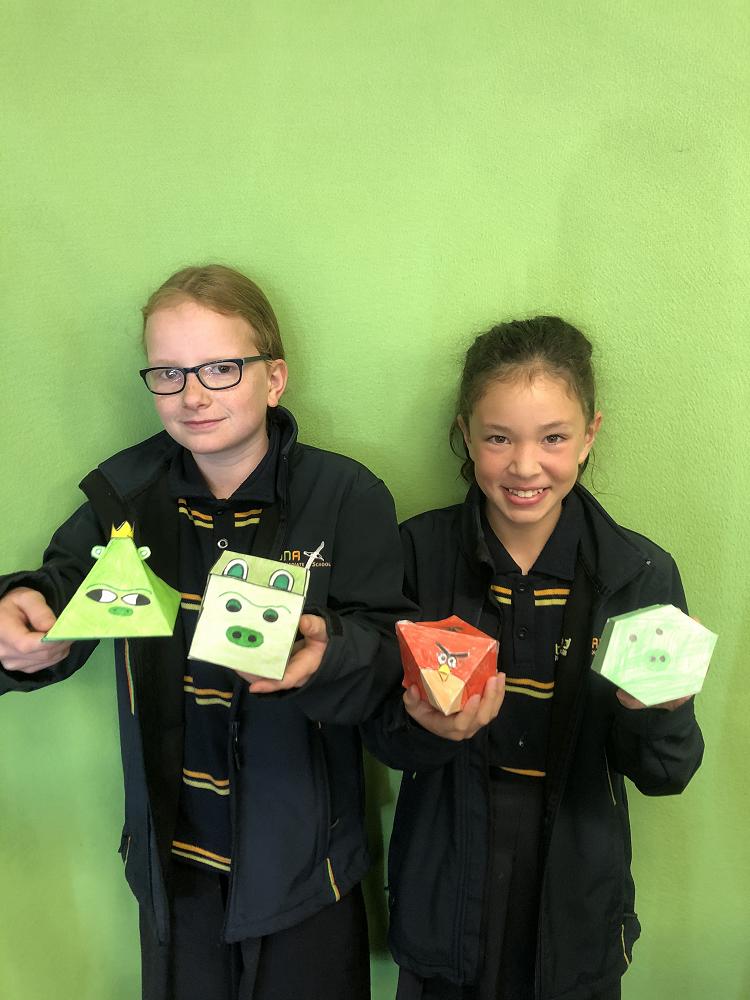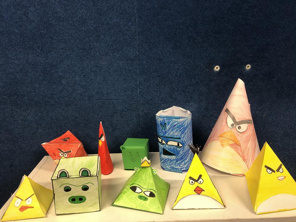 For our maths we have been learning about 3D and 2D shapes. We made these angry bird-like shapes using rulers and protractors making sure each side was even so the shape would work without any uneven sides to interfere. There are all different types of birds you can make like red,chuck,bomb and those little blue birds and even the king pig.