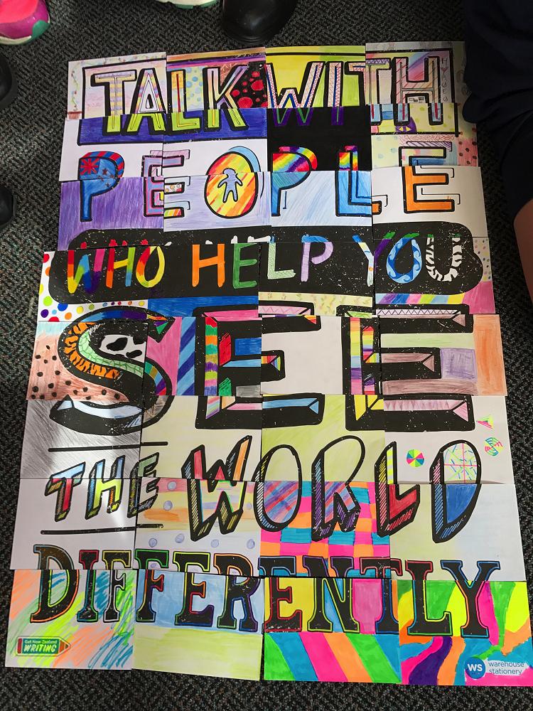 The first thing we received was a poster about their class with heaps of information about them.We also got some postcards with metaphors from each student in the class.When we placed the postcards in order there was a picture on the back. It said “Talk with people who help you see the world differently” in bright colourful letters.