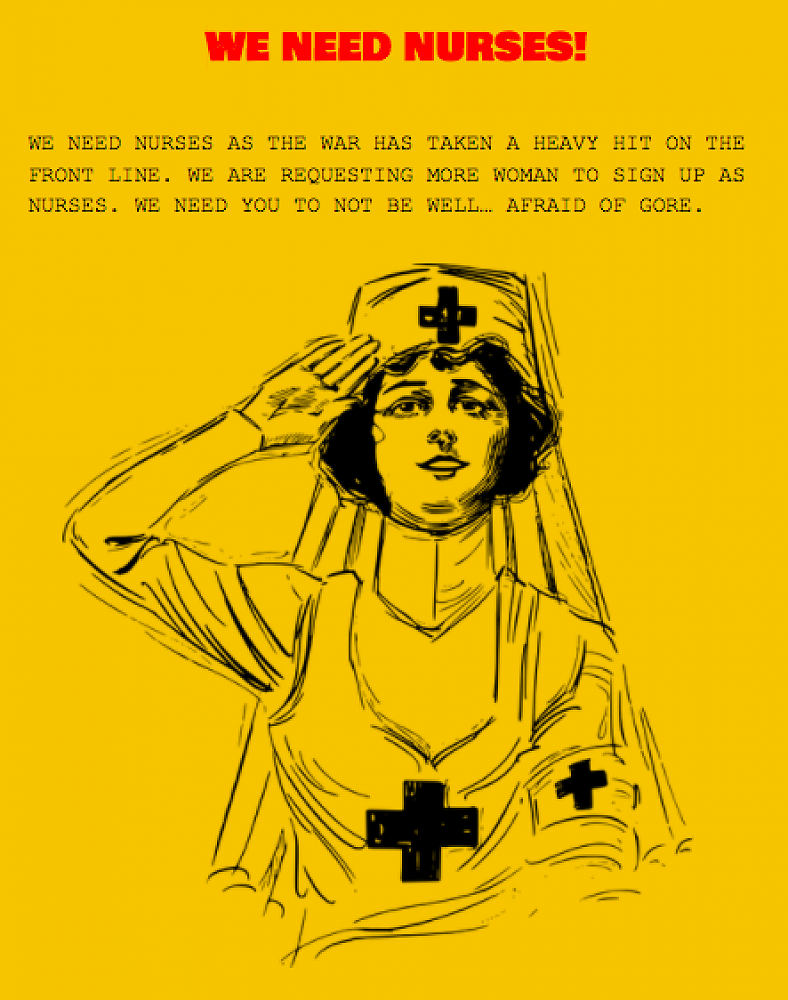Jack Martin has been reading an article called 'Grey Angels' which is about the Nurses working in the war. As a response he has made a newspaper ad, encouraging more nurses to sign up.