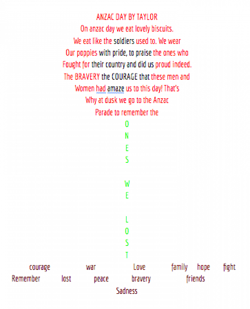 Taylor Templeton - Williams has written a shape poem called 'ANZAC Day.'