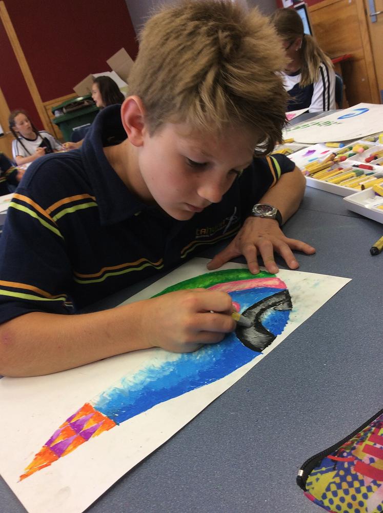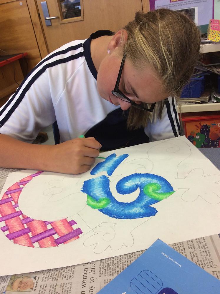 Pupils select a symbol relating to a school value in which to incorporate Maori patterns within. I am amazed at the talent shown by Tahuna pupils when they create a piece of artwork using pastels to show vibrant colours blending into one another.