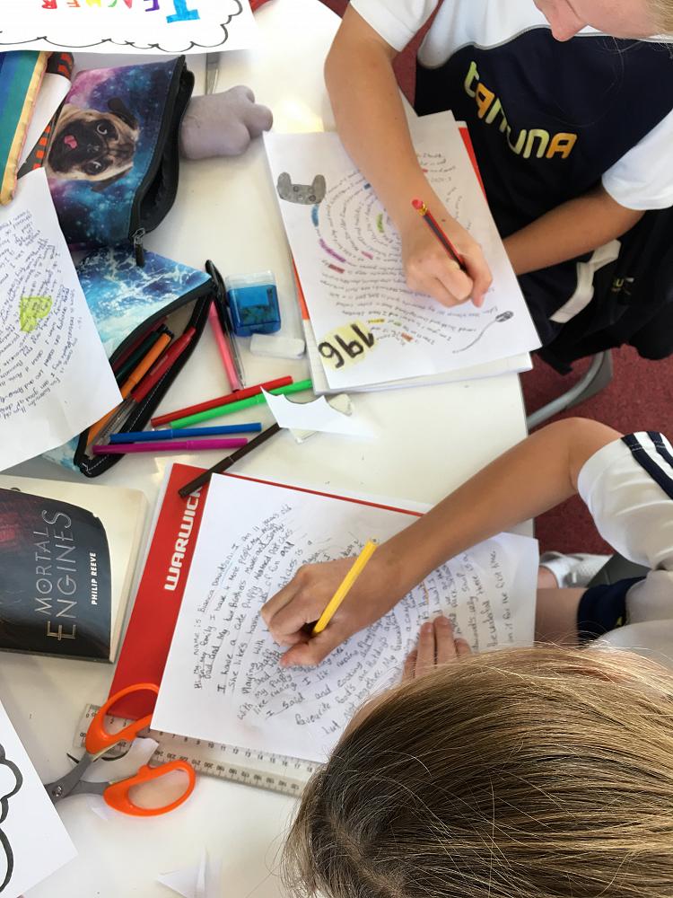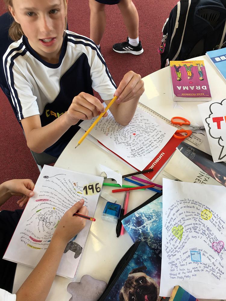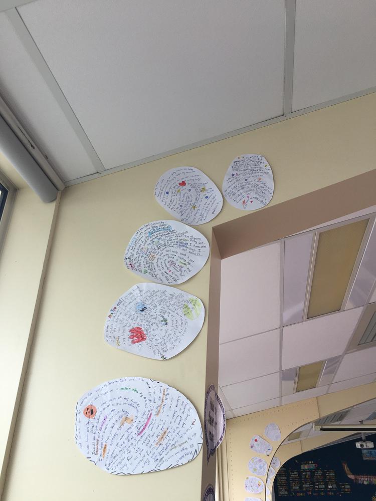 To assist with this our students took their own fingerprints, these were enlarged and then the patterns and grooves were used to guide the pattern of student writing. Our students wrote about their families, holidays, goals and experiences, whatever they think is an important building block of their own identity.