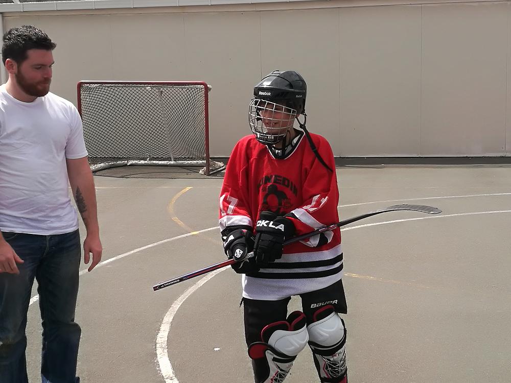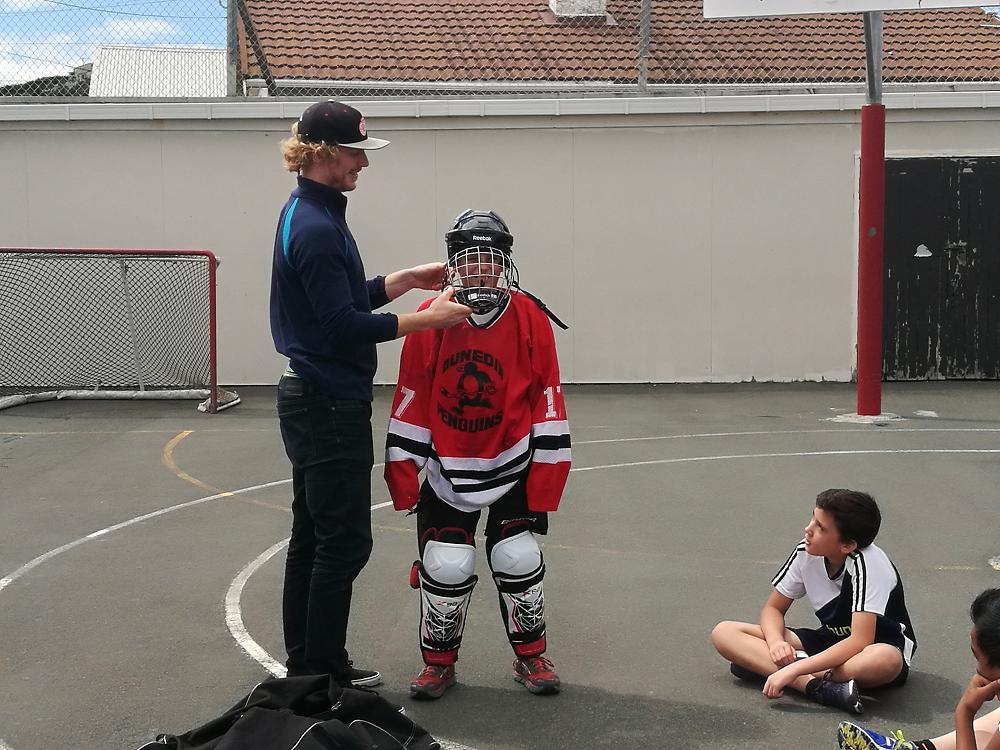 Harris from Room 20 tries on Ice Hockey gear during lessons.