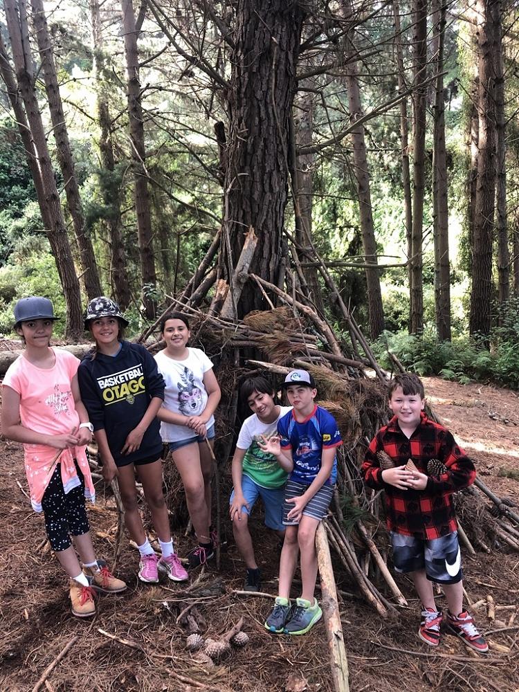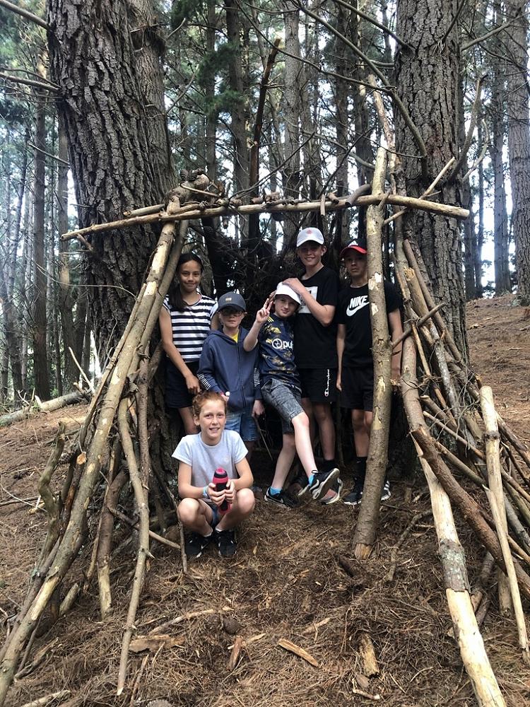 Just before dinner the whole class went for a walk into the bush. It was about a 7min walk but when we were up there Miss Bates explained what we were doing and she said we are building a bivvie. We split into our activity groups and started building. First we built a frame in between two trees then our ground went around gathering sticks to put on the frame. Once all the sticks were covering the frame we all used our hands and feet to sweep up leaves off the ground. We threw all the leaves on the sticks until there were no gaps. Connor found what he called the Conner corner. While my group were working together making a door nick was building a fake campfire. It was cool until we smashed it and built a bigger and better one in the bivvie. After we did that Noah and I moved a giant log beside the bivvie to make a lovely seat. We cleared all the leaves off the ground and found a big stick and a leaf and made a flag. The bivvie was called the High Five hut. Our hands were really dirty because all the sticks had dirt and moss on them. Our heads were dripping with sweat. After that we walked back to camp and had some lovely burgers for dinner.
