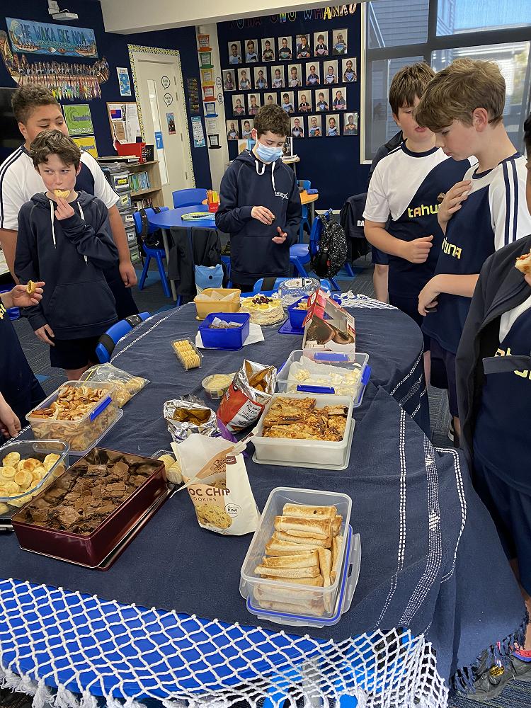 Friday on the last day of term Room Six did a shared lunch. A few days before the shared lunch Mr Min told the class who was bringing sweet or savoury food for the lunch based on their birthdays. On the day of the shared lunch most of the children in the classroom brought food to share. We gathered around a table to share kai together to celebrate the end of term 2!