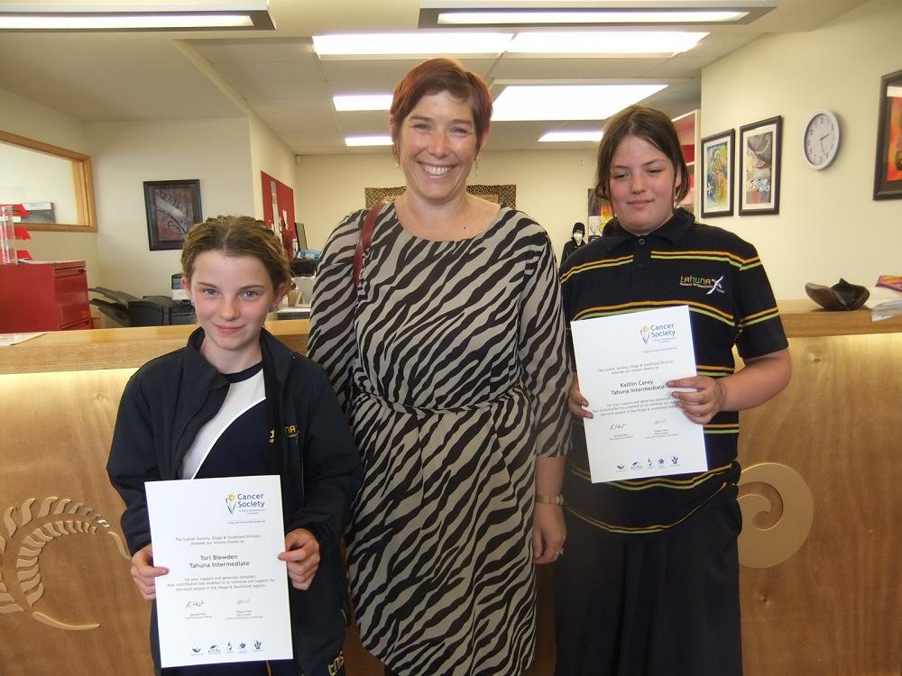 Kaitlin Carey and Tori Blewden received a visit from Tracey Fleet, the Team Leader for Community Events & Campaigns for the Cancer Society. She met with the girls and thanked them for their donation, before presenting them with certificates of acknowledgement for their efforts.