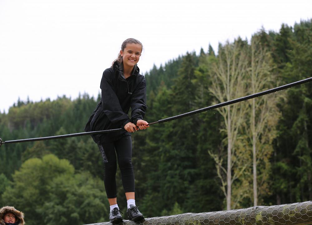 We ran down towards the course with Mr Phillips. The rain dripped on my head as we ran to the first obstacle, me and Tayla ran to the tightrope and climbed up the ladder. We started walking across the rope to the Shrek Bridge, someone else was already on the bridge though and told us “You’re going the wrong way!” We didn’t really care though, we just waited till they got off so we could go on it. I stood on the first plank of wood it wobbled dangerously under my feet, I grasped the ropes on the sides as to not fall off. I stepped backwards on to the platform “I’m not going on this!”I said. “Ok then I will!” Said Tayla standing on the first plank. “Ok.” I said and started heading down the tightrope again, as I was walking Mr Phillips took a photo of me, I don’t really like getting photos taken but I smiled anyway.