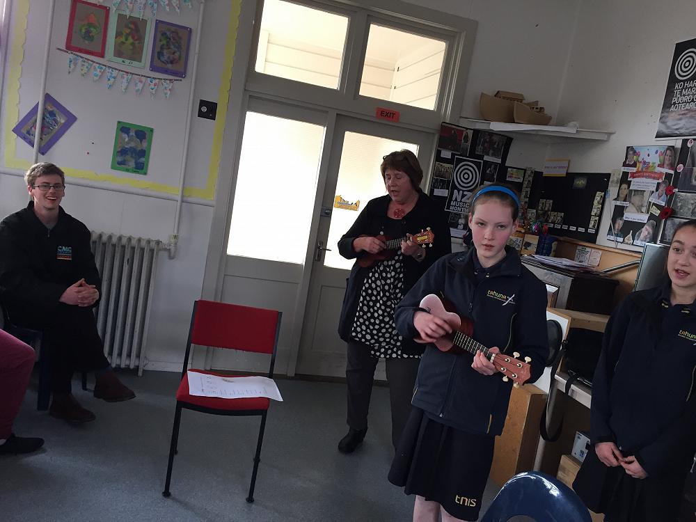 Members of the Te Taiopeka group travelled over to Sarah Cohen school to help with Maori language week celebrations and thrilled staff and students with 3 waiata. The contingent shared a number of other popular Maori songs via ukulele and were so popular the senior teacher asked for a repeat performance of an earlier item as teachers and audience members wanted to sing it. It was a fabulous community moment enjoyed by Te Taiopeka students and of course the very special audience members.
