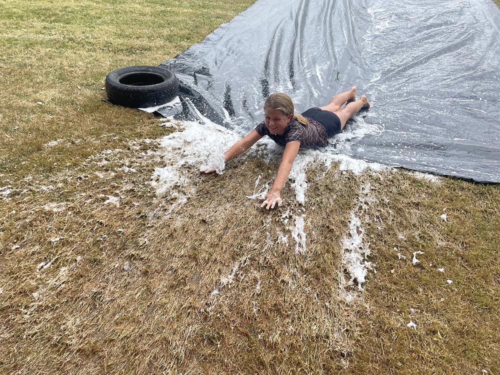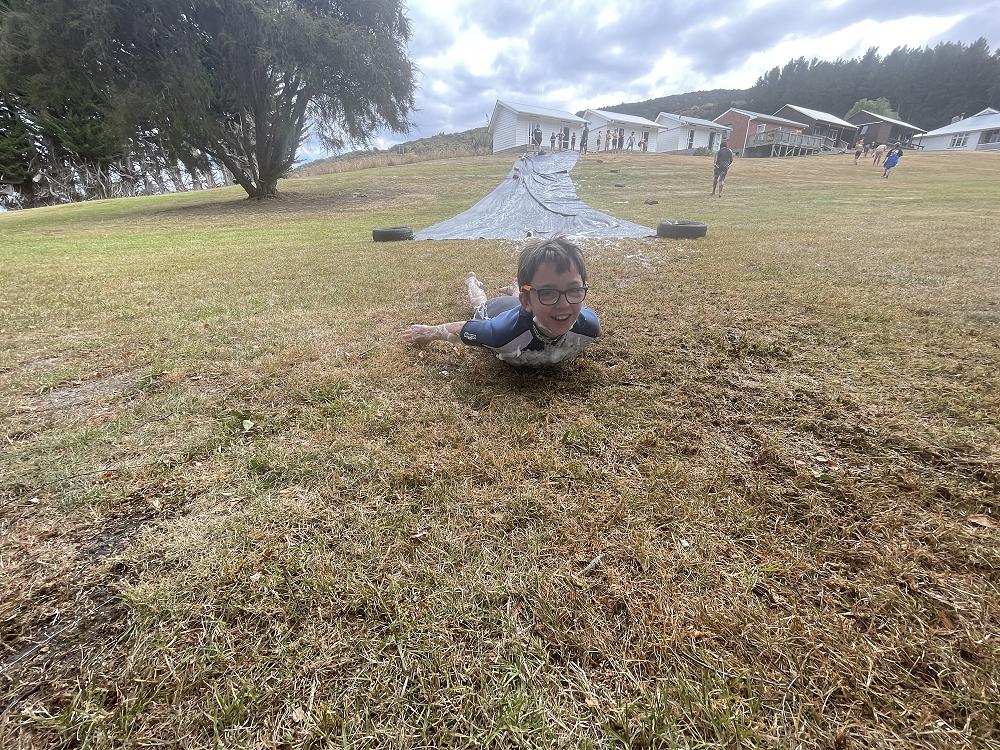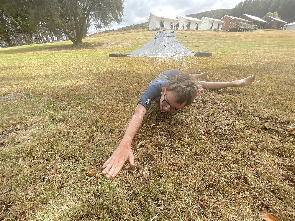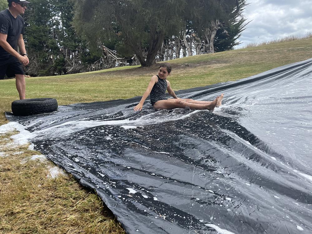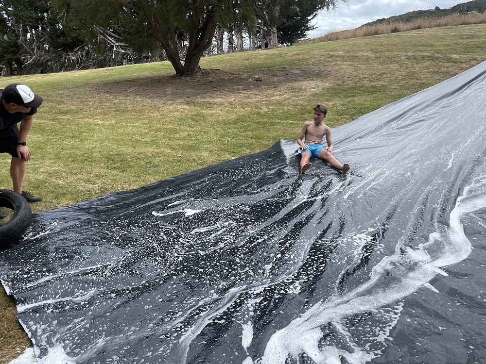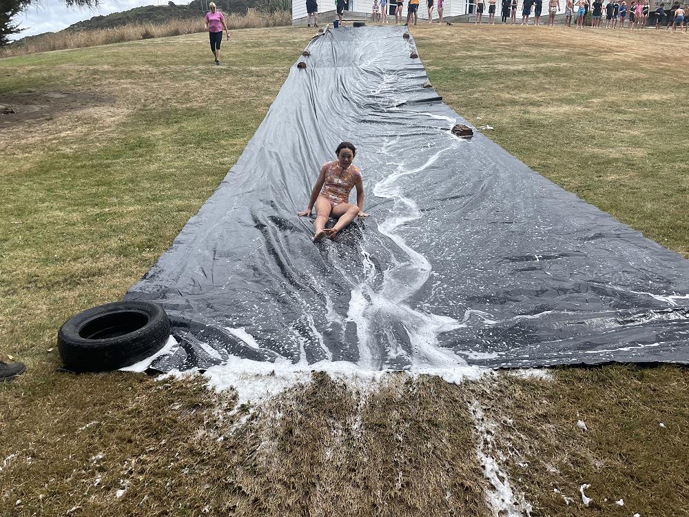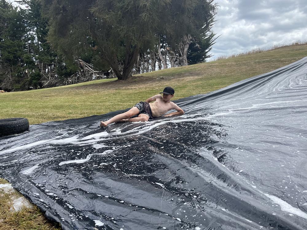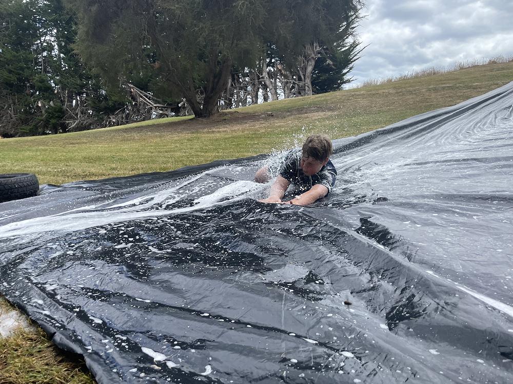 It got a bit windy so they put tires on the edges of the slide to make sure it wouldn’t blow away. It was scary because you think that you're going to crash into them. In the end we were really soapy and we had grass stuck to our swimming togs but we enjoyed it.