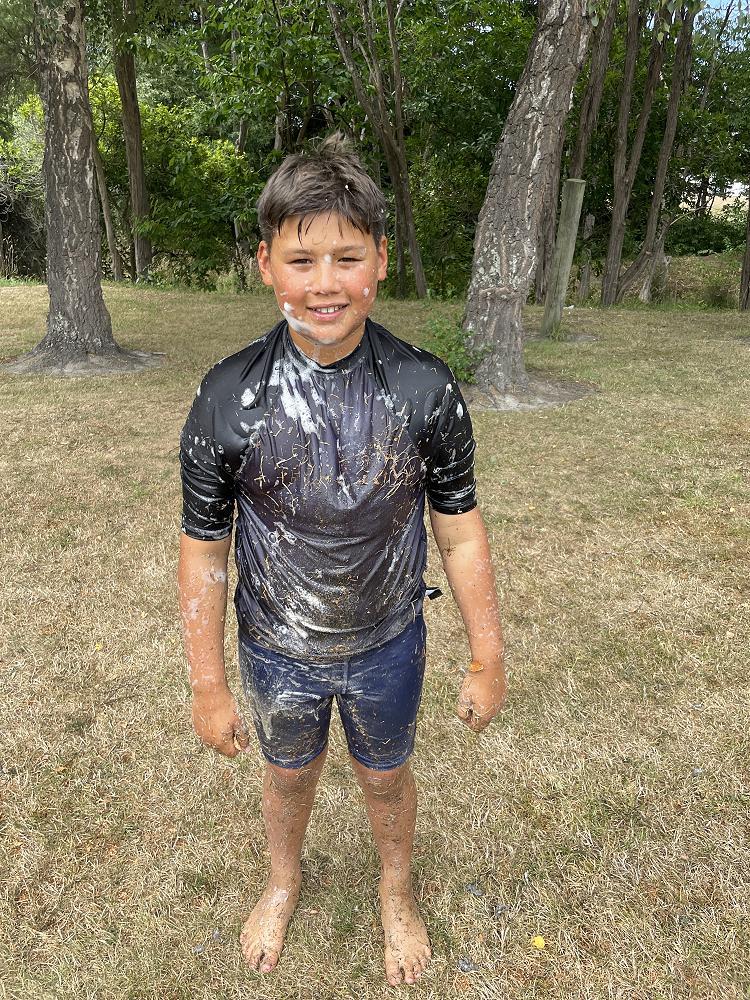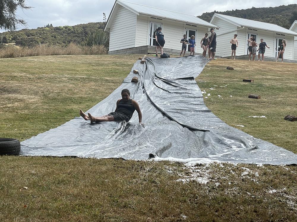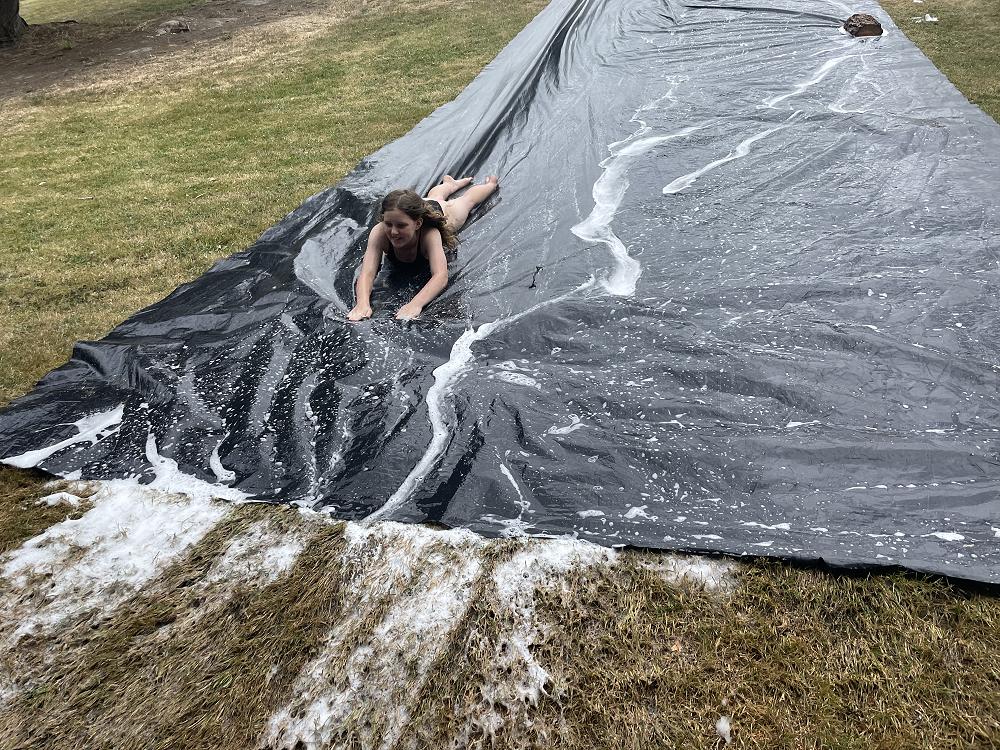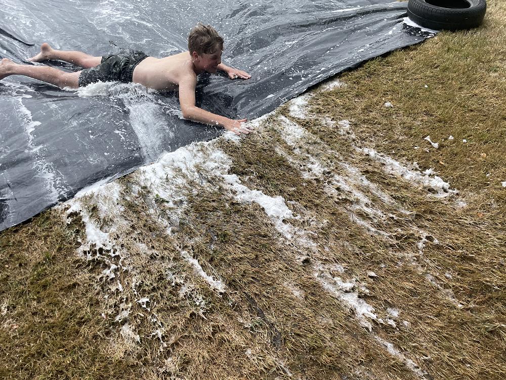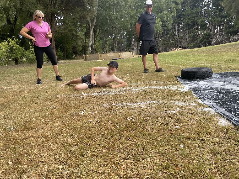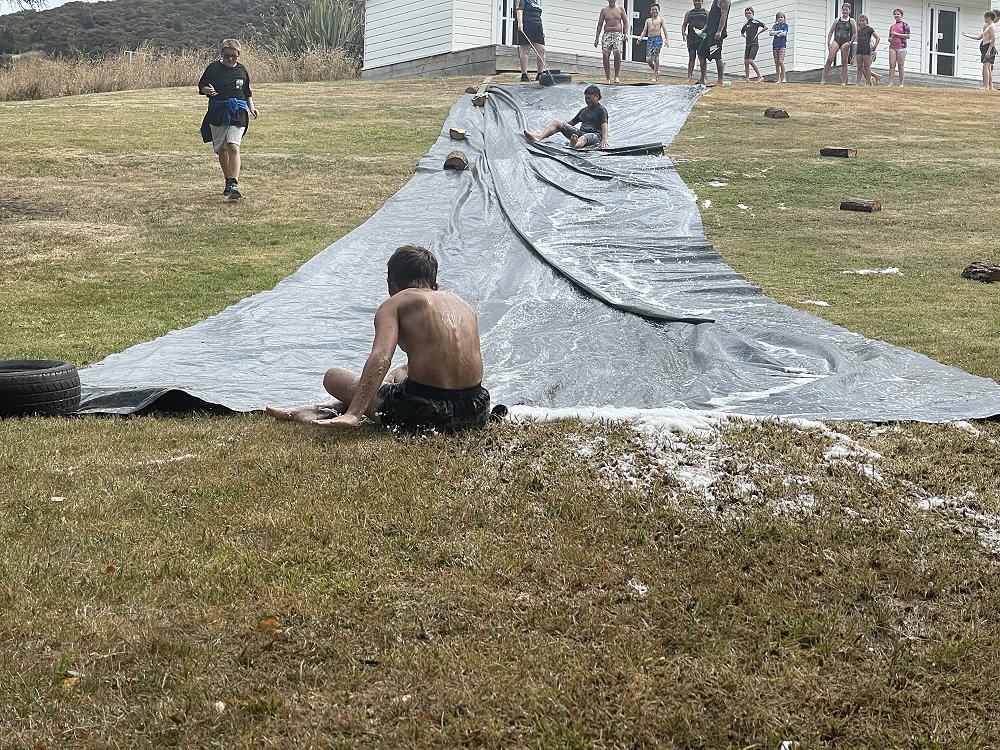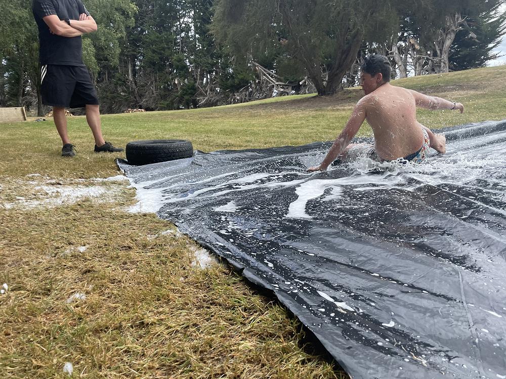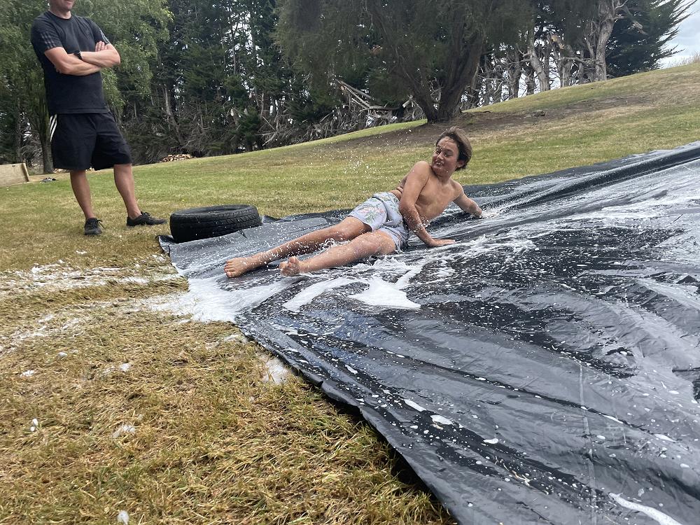 It got a bit windy so they put tires on the edges of the slide to make sure it wouldn’t blow away. It was scary because you think that you're going to crash into them. In the end we were really soapy and we had grass stuck to our swimming togs but we enjoyed it.