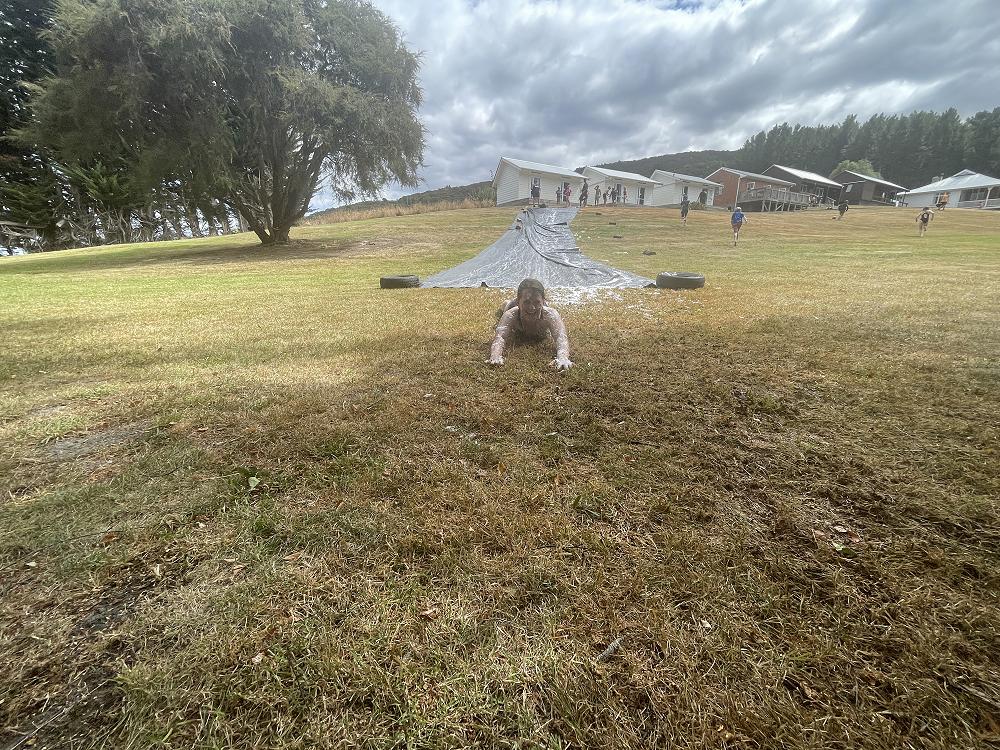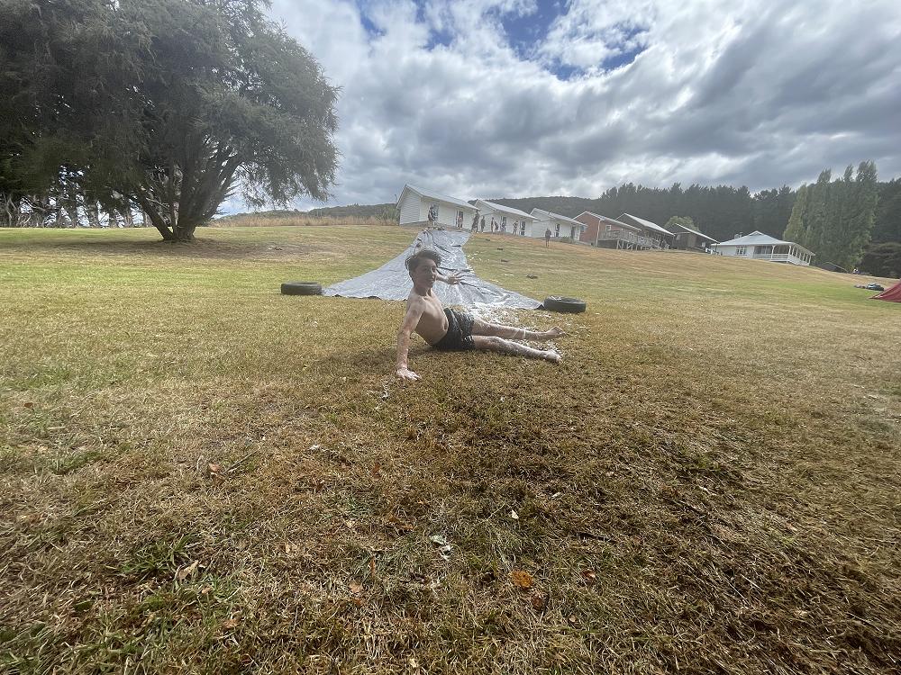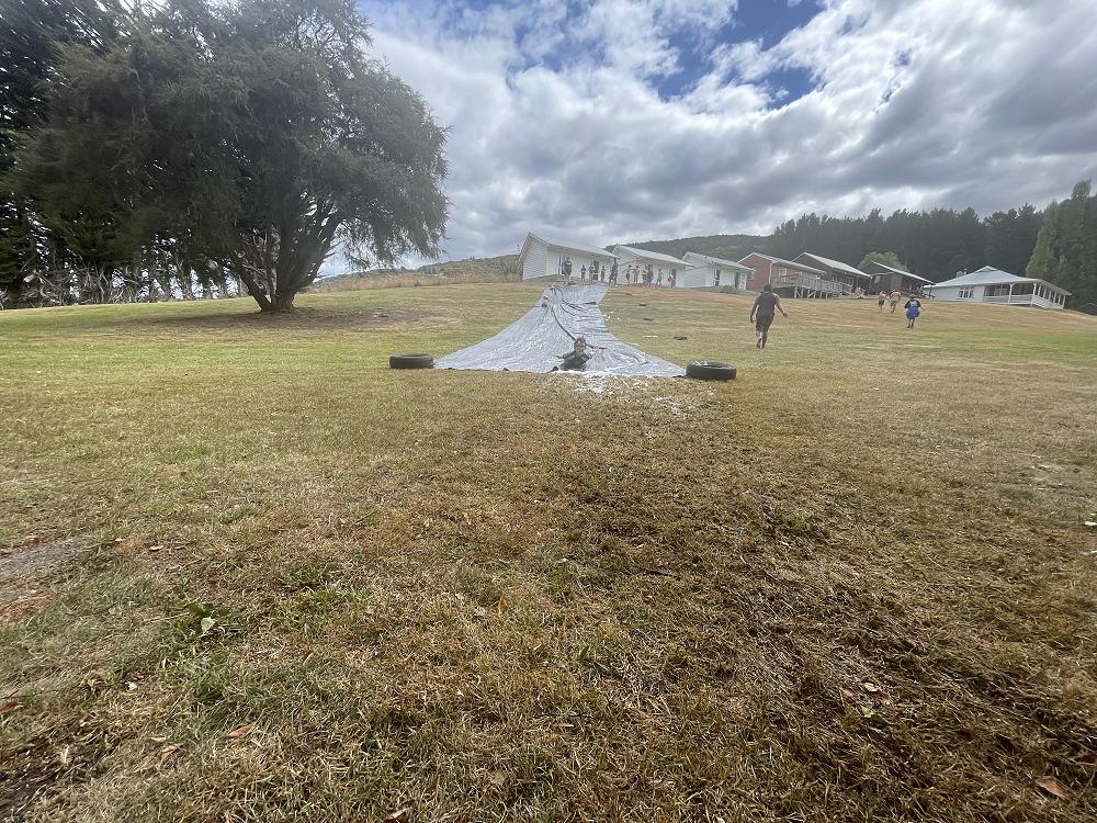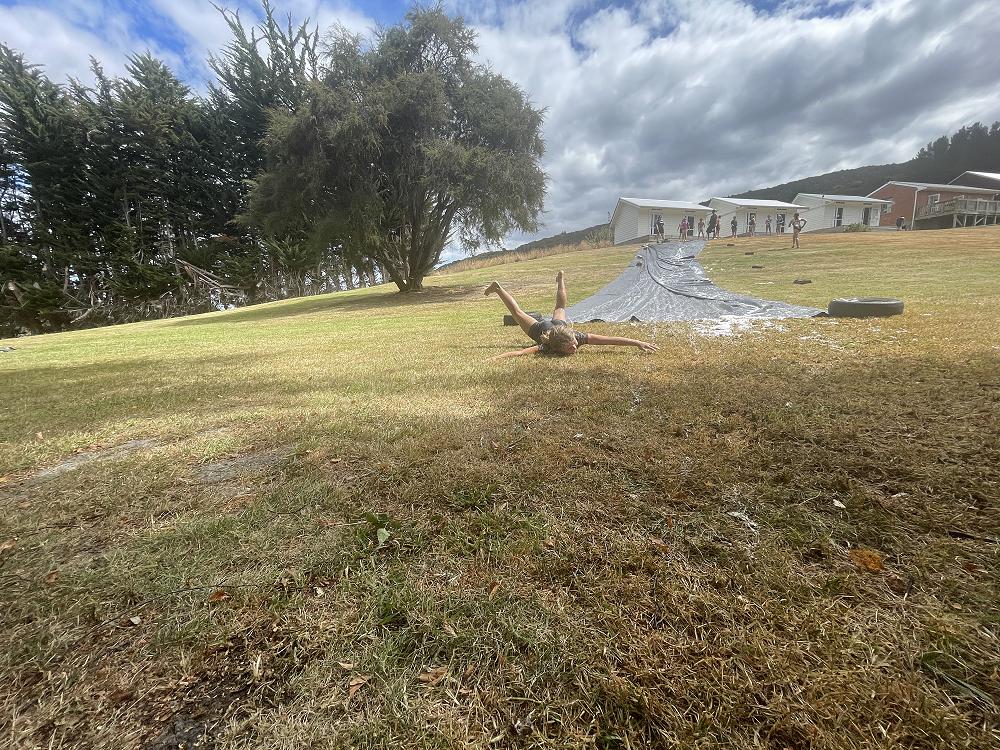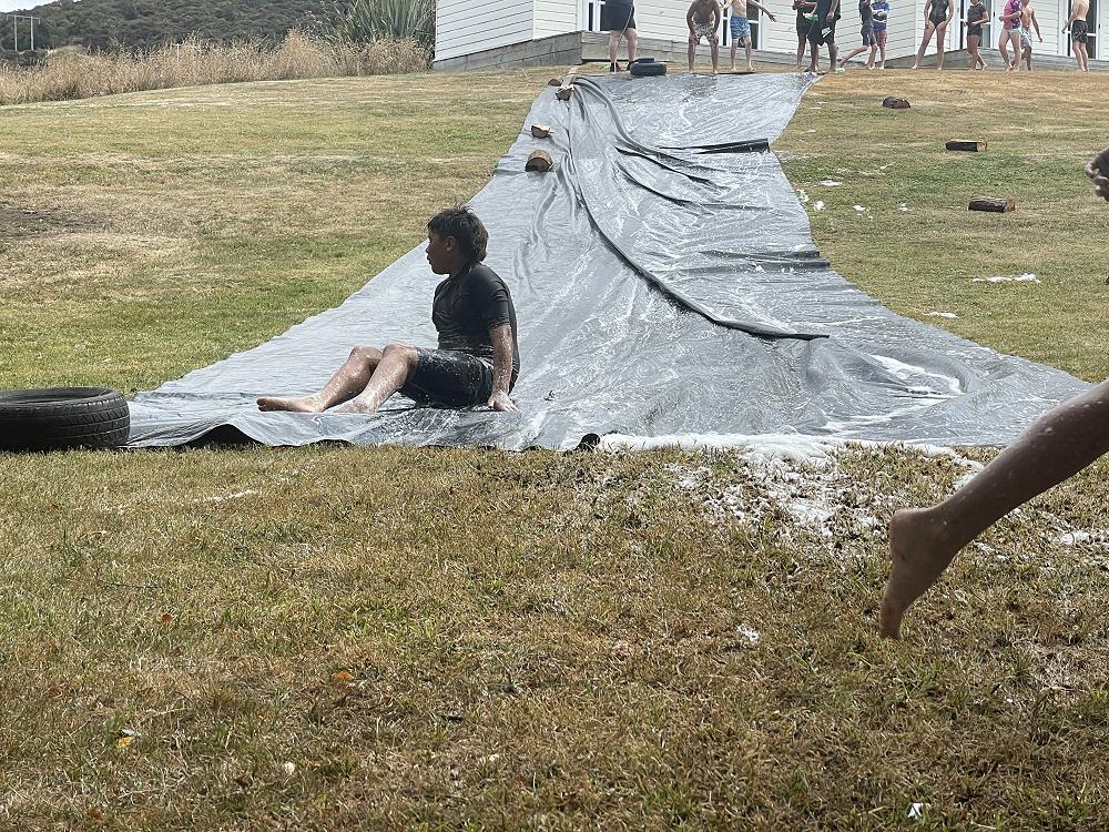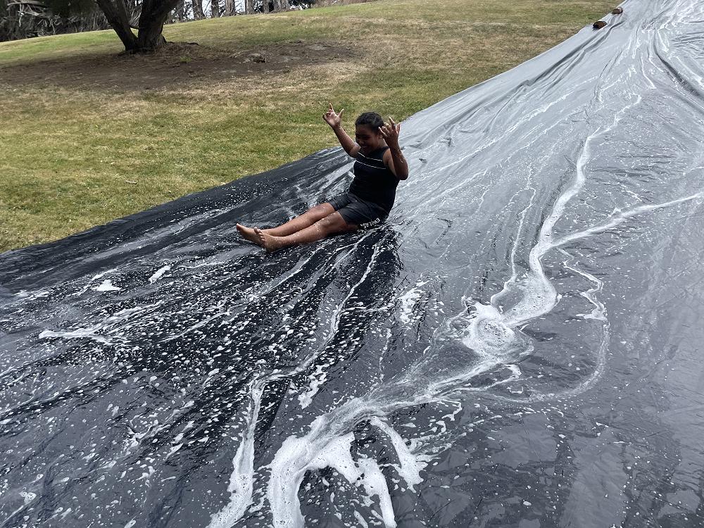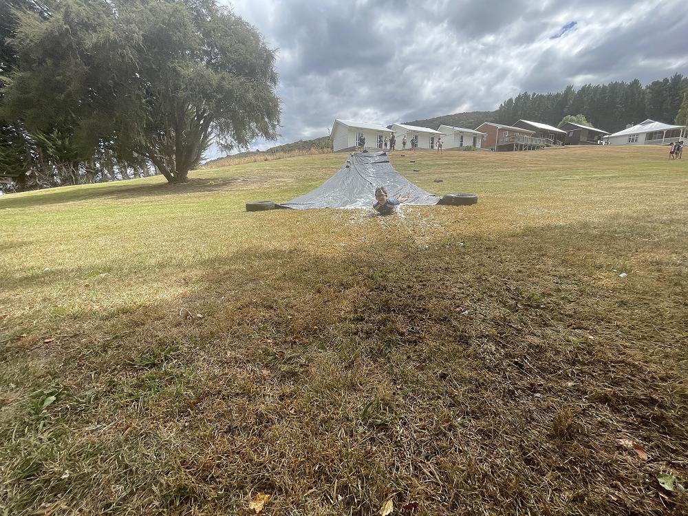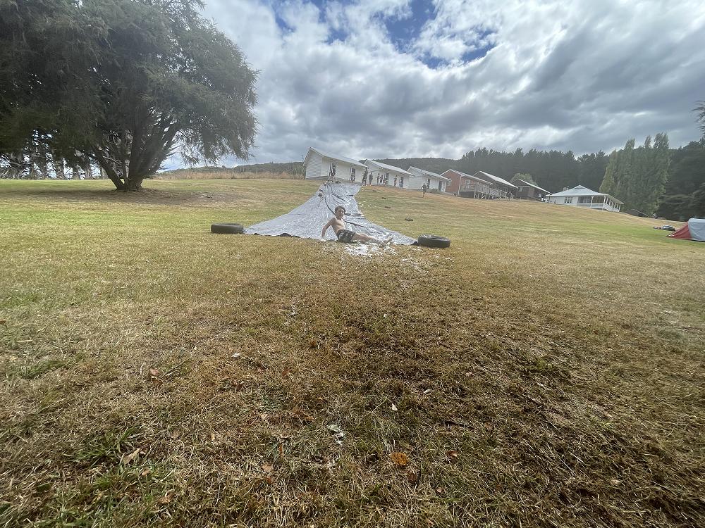 It was a very hot day so the parent helpers set up a water slide (made out of a really big tarpaulin) down the hill. They poured dish washing liquid and water on the slide to make it slippery. We lined up and took turns sliding down.