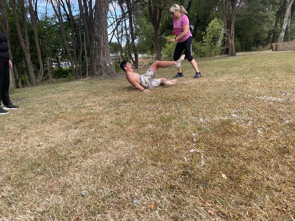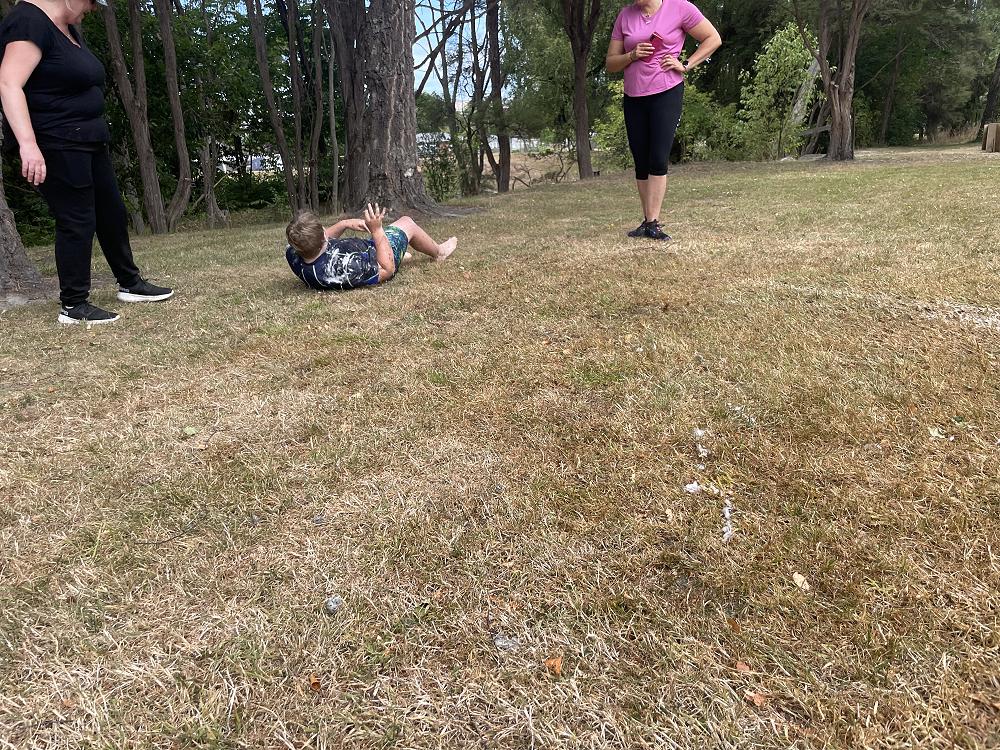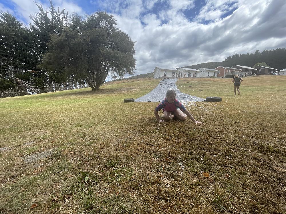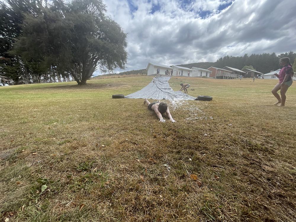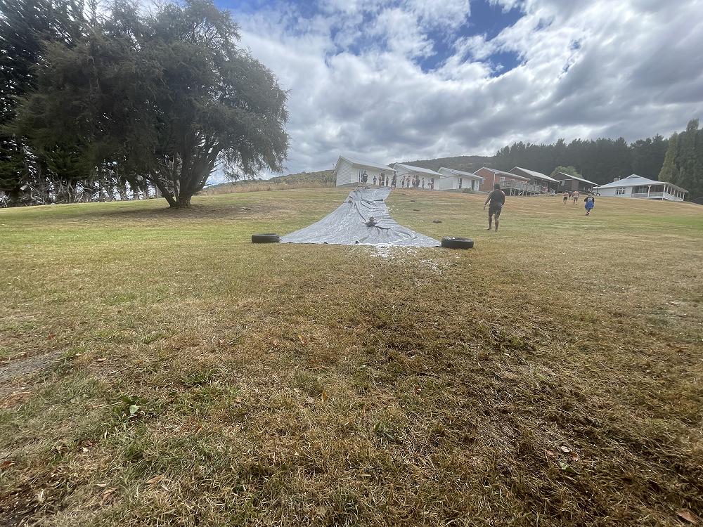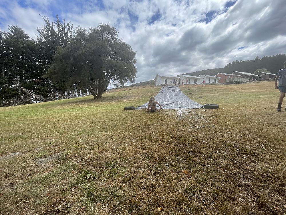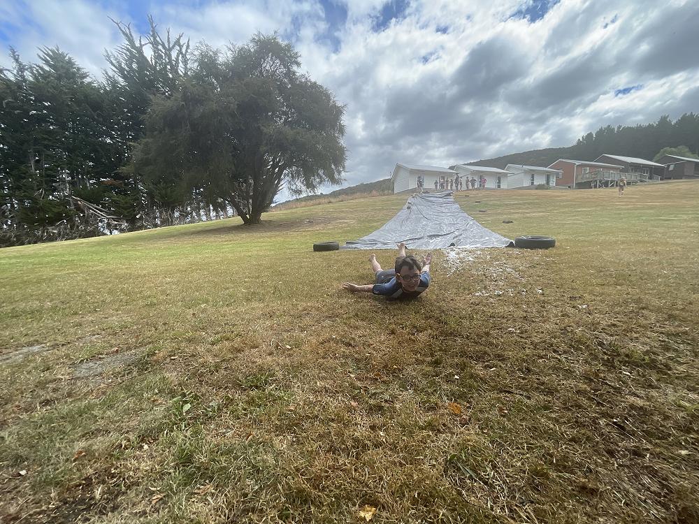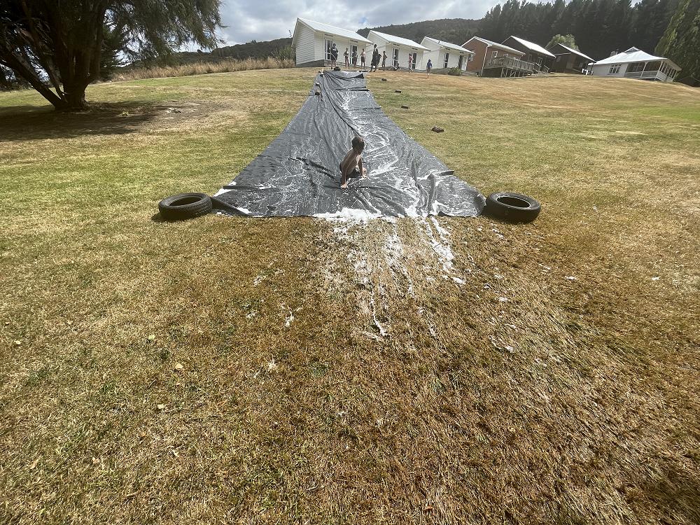 It was a very hot day so the parent helpers set up a water slide (made out of a really big tarpaulin) down the hill. They poured dish washing liquid and water on the slide to make it slippery. We lined up and took turns sliding down.