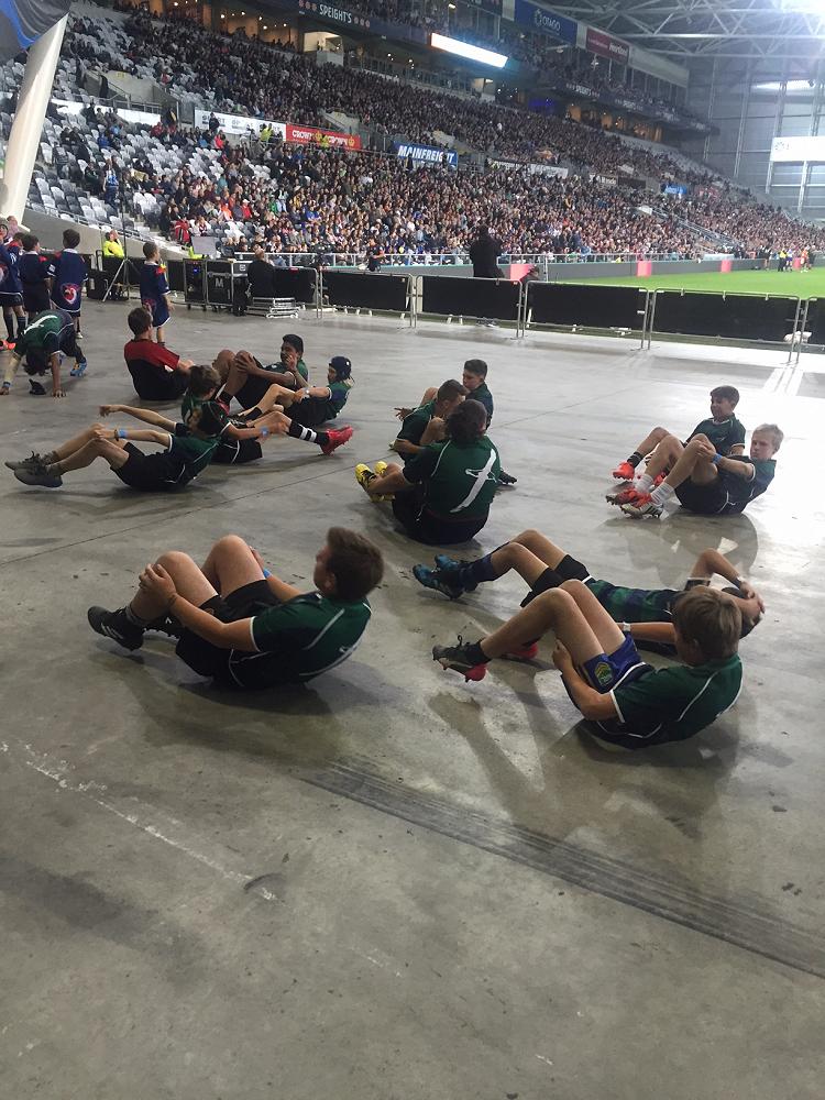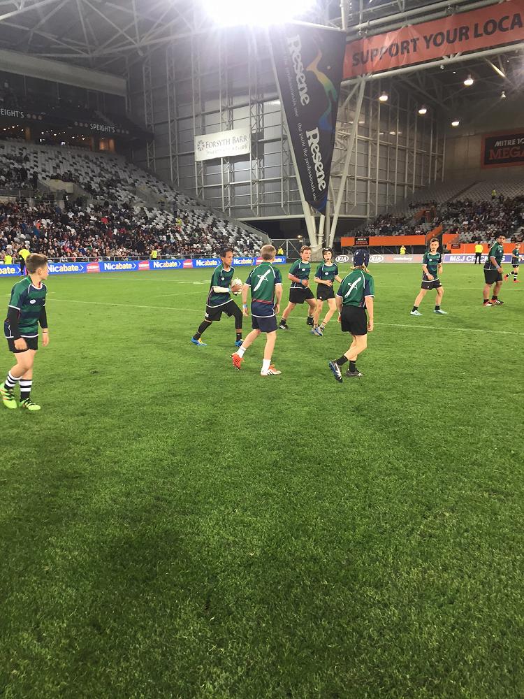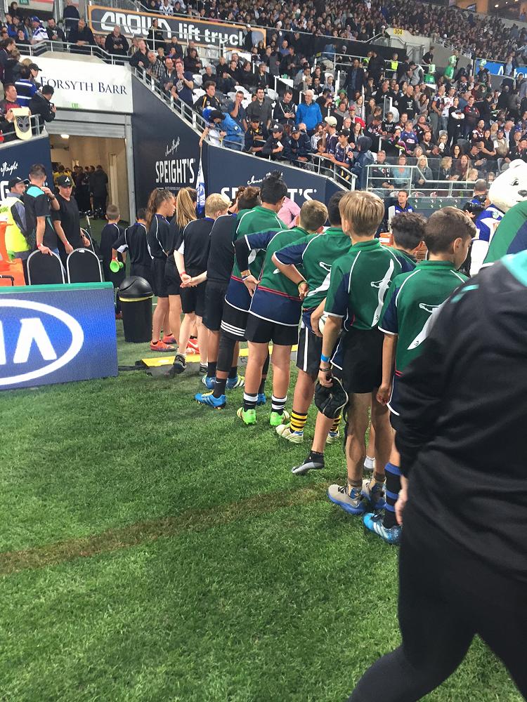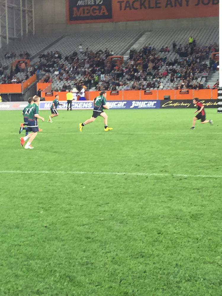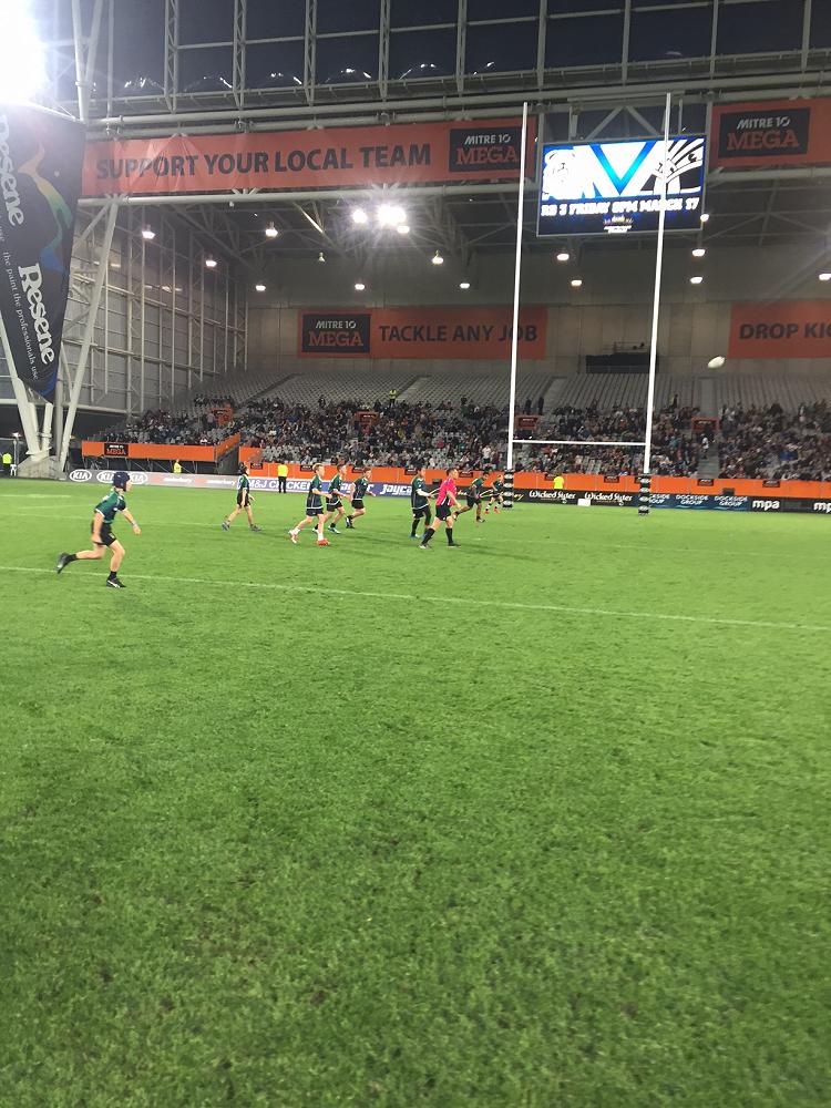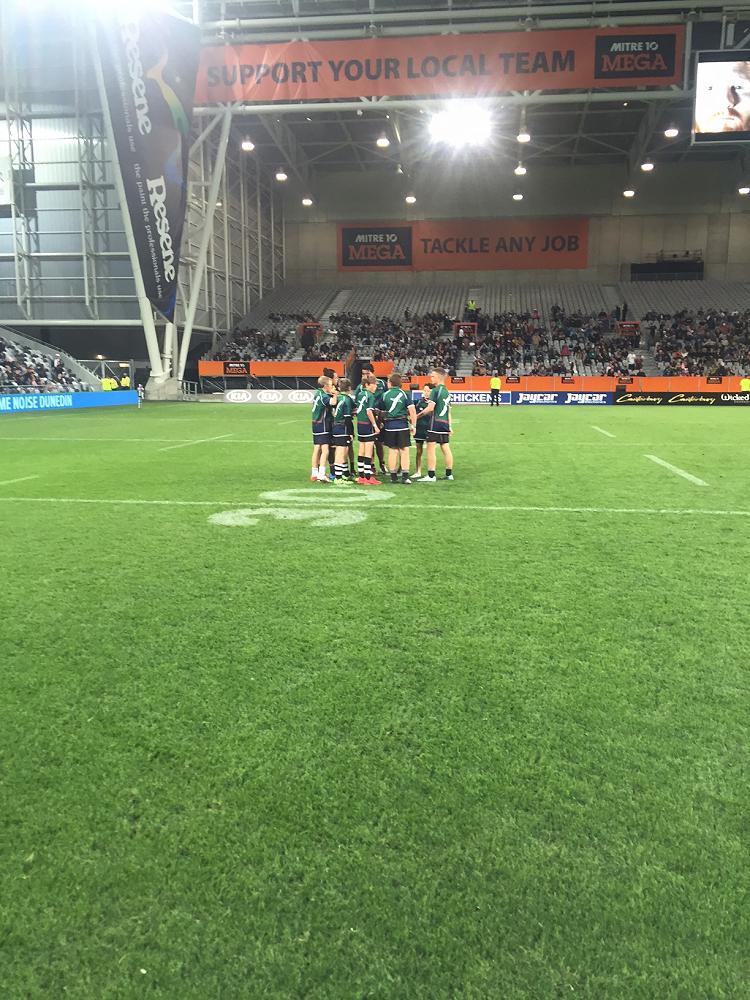 The Tahuna year 8 league team made it into the half time show at the Forsyth Barr stadium. We had to play a DNI team who we had beat earlier in the day at Logan Park. They were a big team with lots of fast players. Before the game we walked on with the Warriors and the Bulldogs and we got to wear some of their jerseys. It was awesome! At half time we were the guard of honour for the teams when they ran on. We put our hands out to high five them!