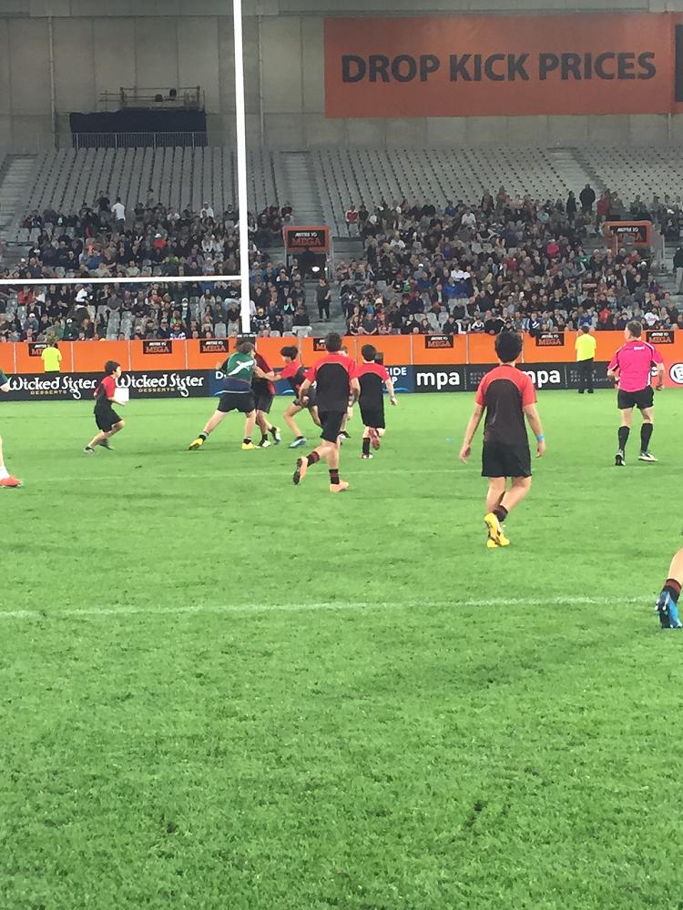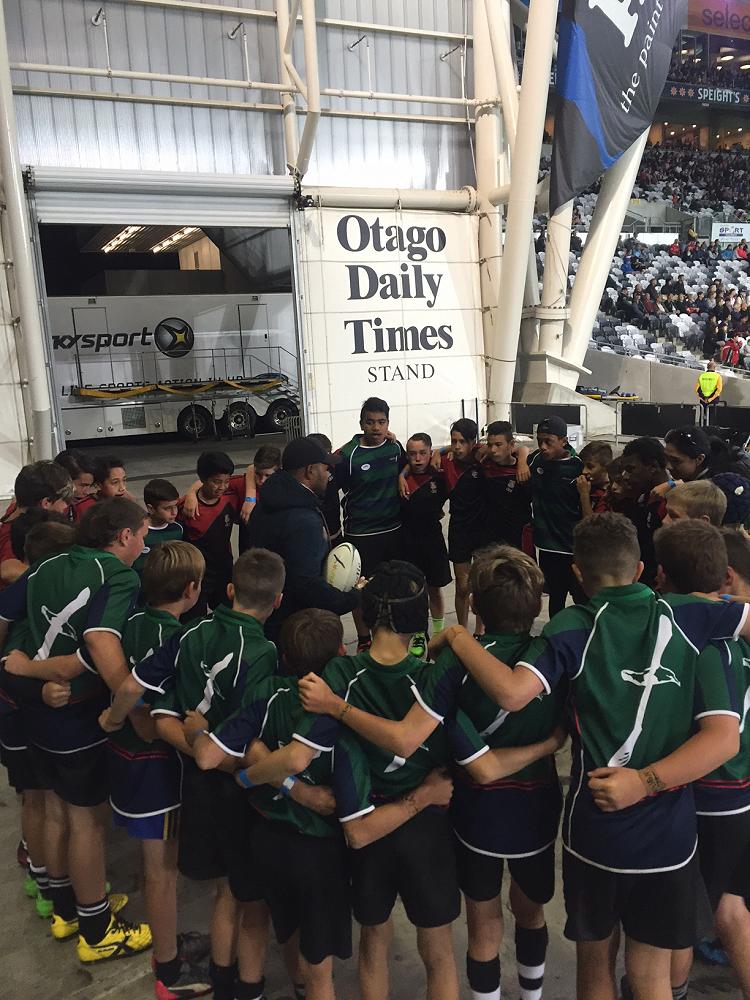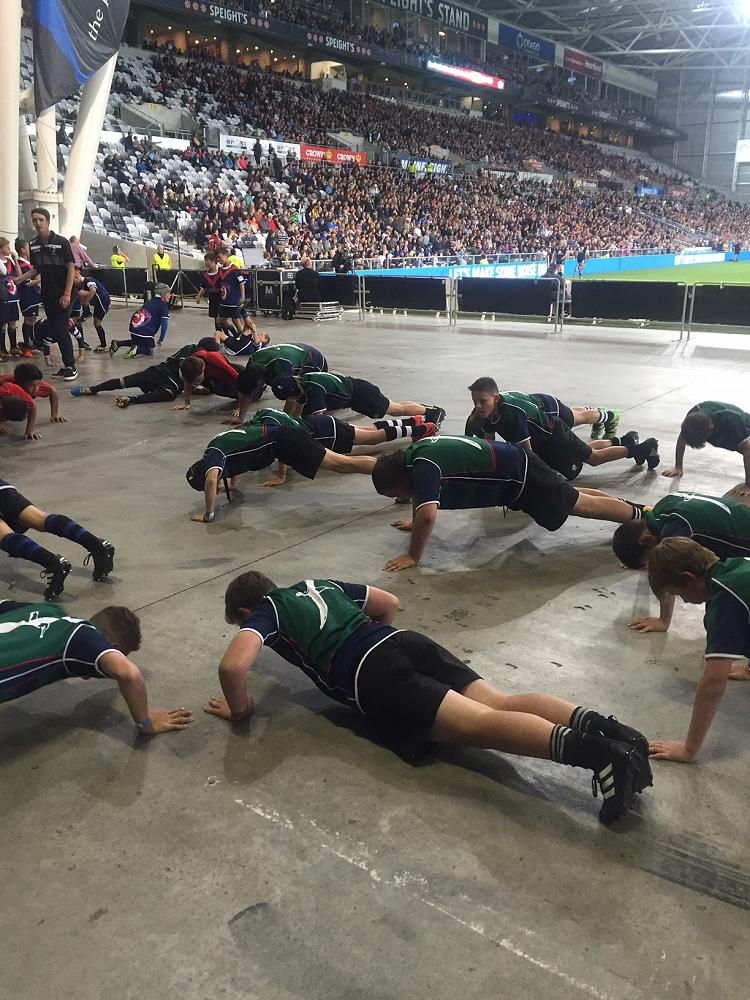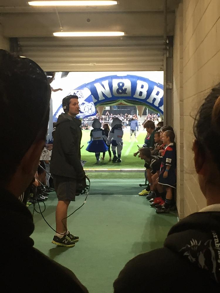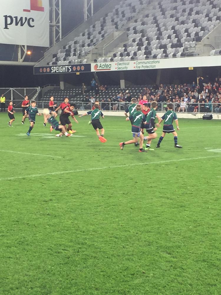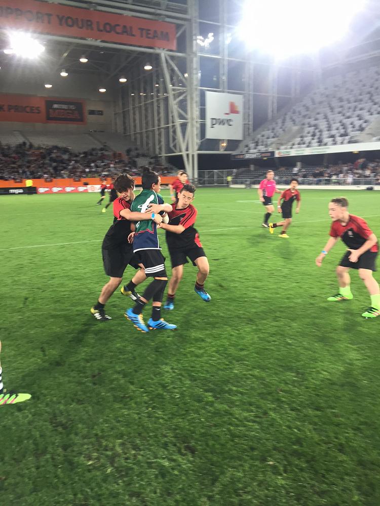 The Tahuna year 8 league team made it into the half time show at the Forsyth Barr stadium. We had to play a DNI team who we had beat earlier in the day at Logan Park. They were a big team with lots of fast players. Before the game we walked on with the Warriors and the Bulldogs and we got to wear some of their jerseys. It was awesome! At half time we were the guard of honour for the teams when they ran on. We put our hands out to high five them!