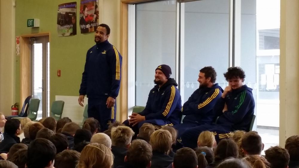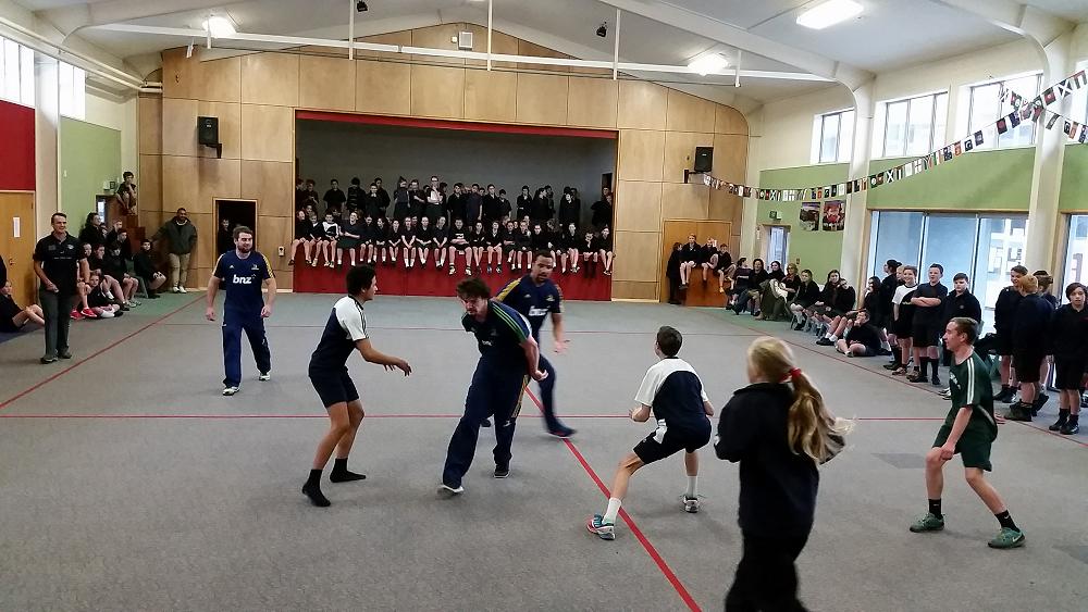 Four members of the Highlanders came to Tahuna on Thursday to answer questions and play touch.