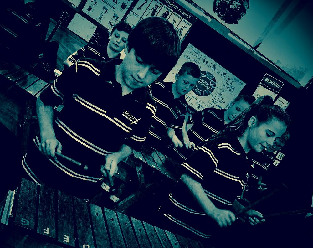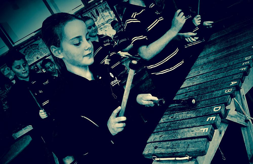 This term the students are learning to play the Marimba with an emphasis on playing simple notation and melody. The students are split into three groups, one playing bass, one middle and one on the top part. The students have to be able to play harmonising notes and contrasting rhythms while reading the music. Multitasking at its best.