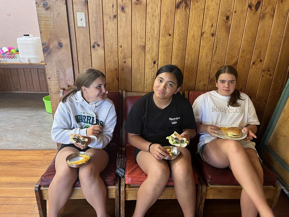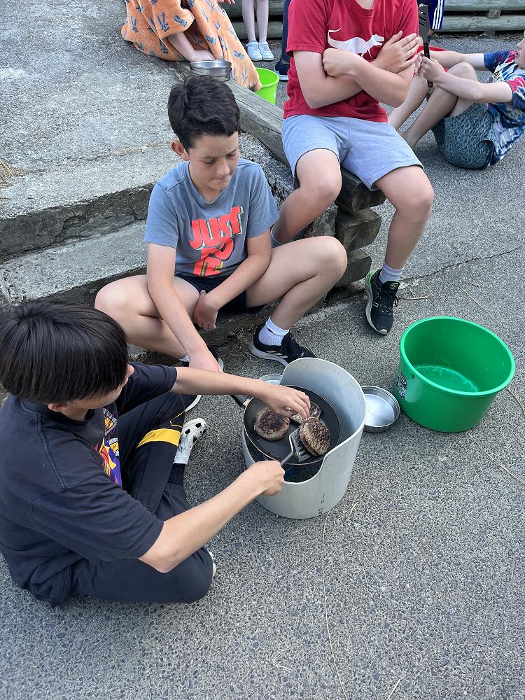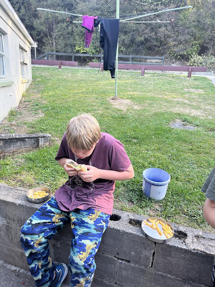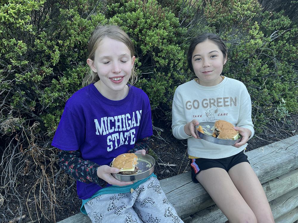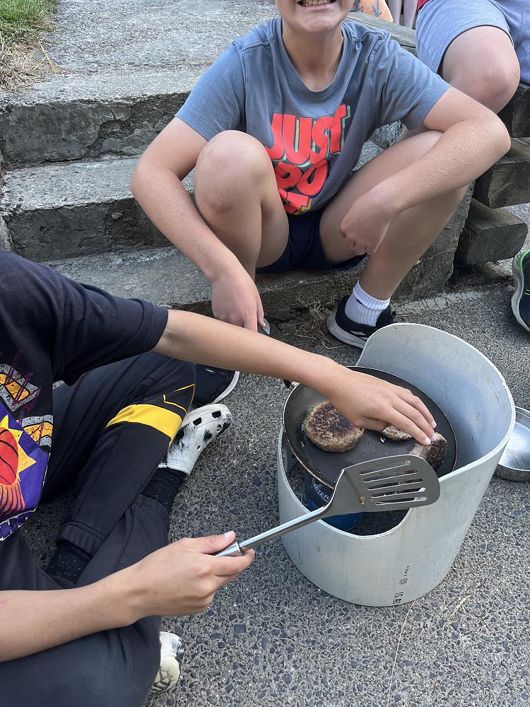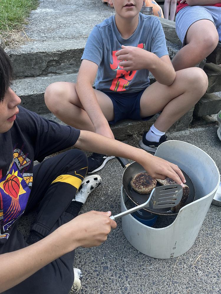On the first night we had burgers using gas cookers and we cooked in groups. On my burger I had … bottom bun meat two cheese slices lettuce top bun - a solid 8/10.