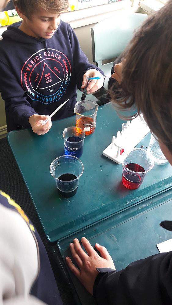 In Science Electives on Fridays we have been doing some very tasty, messy and noisy experiments. So far we have made ice cream, popcorn, rockets and slime. One of our most recent experiments was making a rainbow in a cup which we did by layering liquids with different densities on top of each other. First we mixed different types of sugar to 4 different glasses of water and added different food colourings. Then we had to play around with pipettes and test tubes to get the liquids to carefully layer on top of each other. The result was a success and a unique and interesting drink before lunch.
