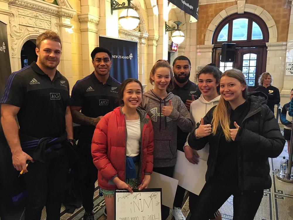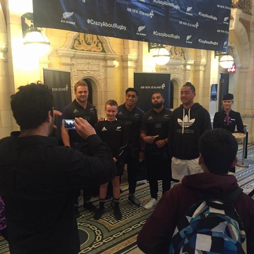 When we arrived we were greeted by some flight attendants from Air New Zealand who gave us some lollies, cookies, and signs. When we went into the the building we lined up to meet three of the All Blacks! We met Sam Cane, Malakai Fekitoa and Lima Sopoaga. They signed our posters and took photos with us.