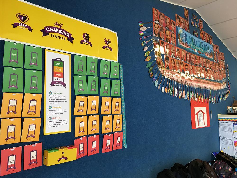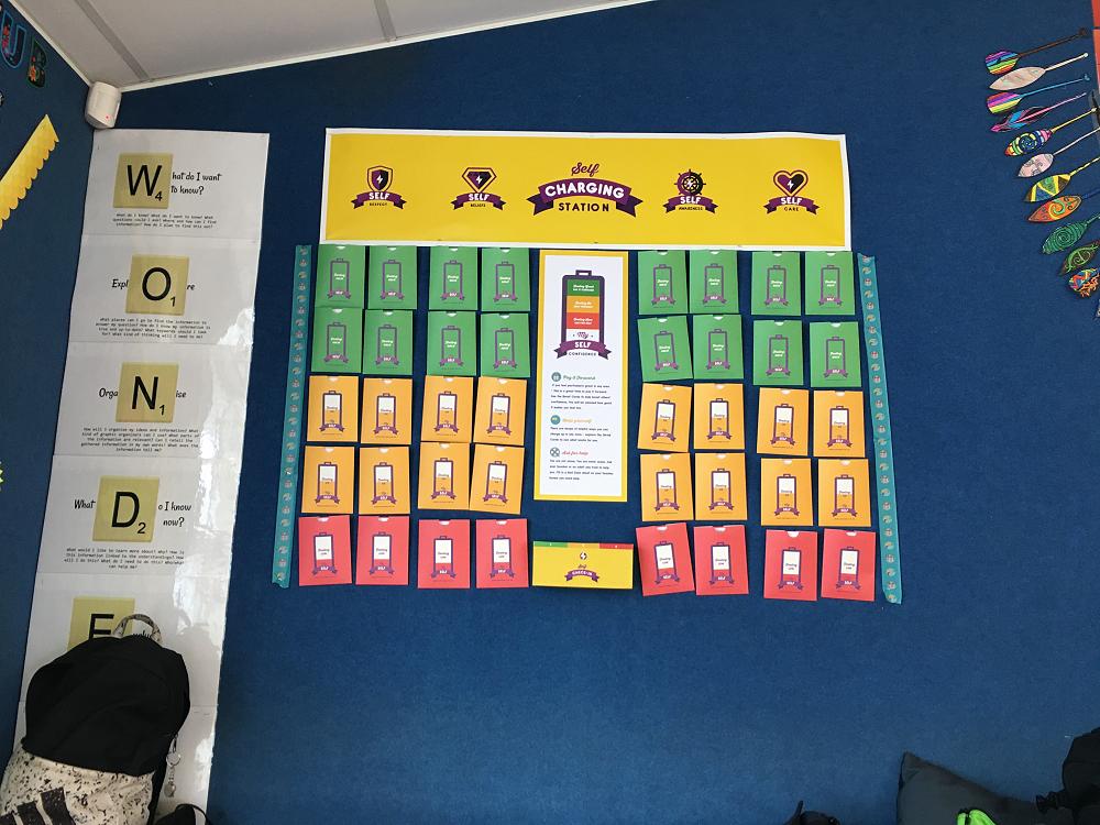 We have set up a charging station where each student will check in each day with how they're going. They each have their own token that they will drop in a specific colour coded box depending on how they're feeling. A green light means they're feeling fully charged and they will select a card that will give them ways to support others. An orange light means they're feeling ok, they will select a card that will give them ideas and behaviours that could make them feel better. A red light means their teacher (a caring adult in their lives) will check in with them and offer support and guidance.