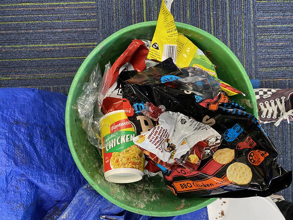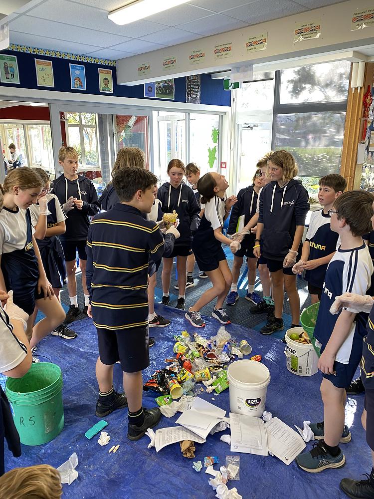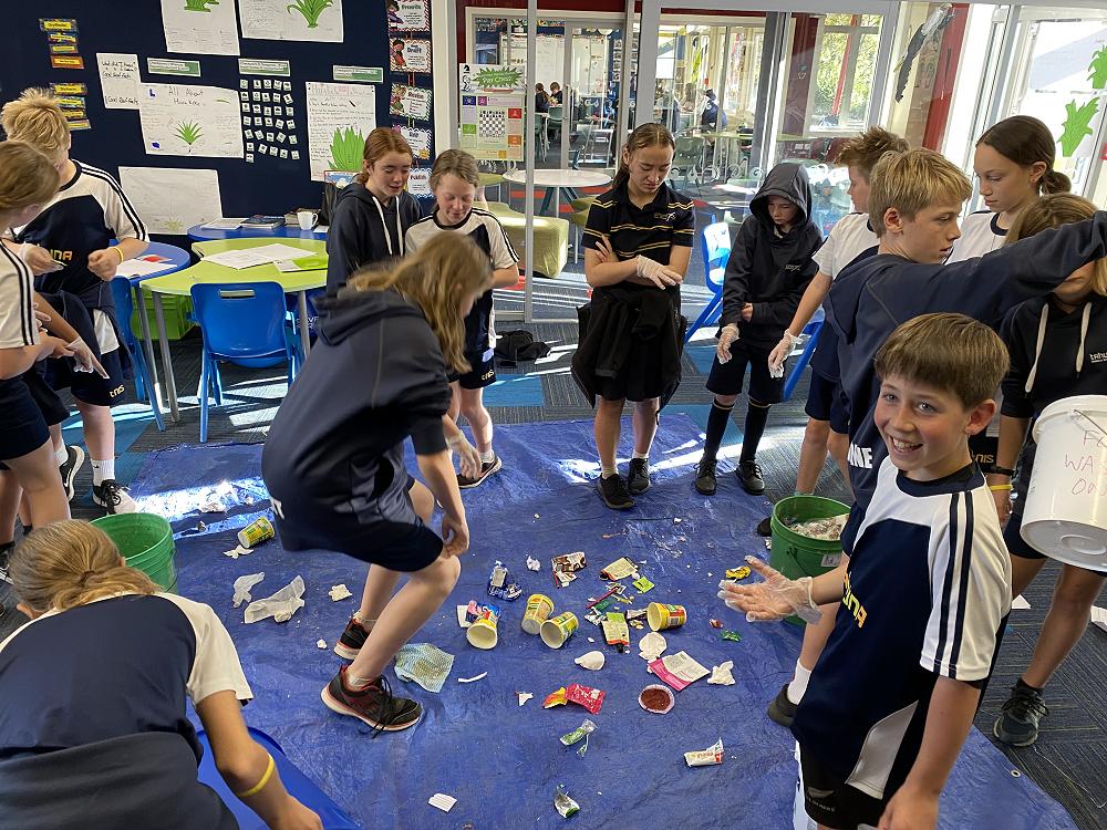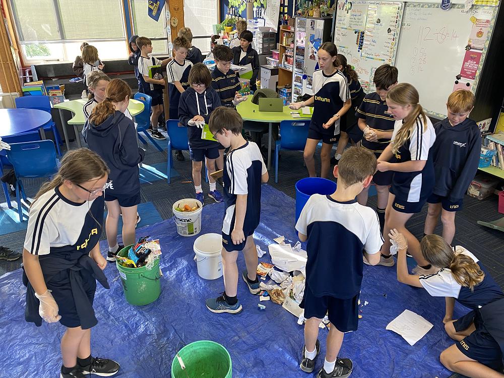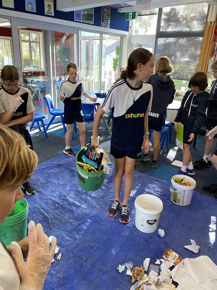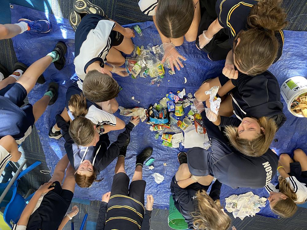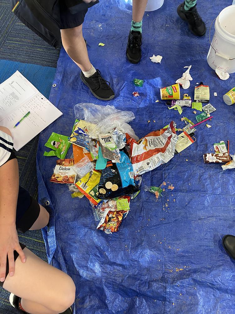 In groups students separated our food waste into plastic packaging, metal, polystyrene, cardboard, paper and food waste categories. We measured the waste and estimated how big the problem is across 18 classes in a school year.