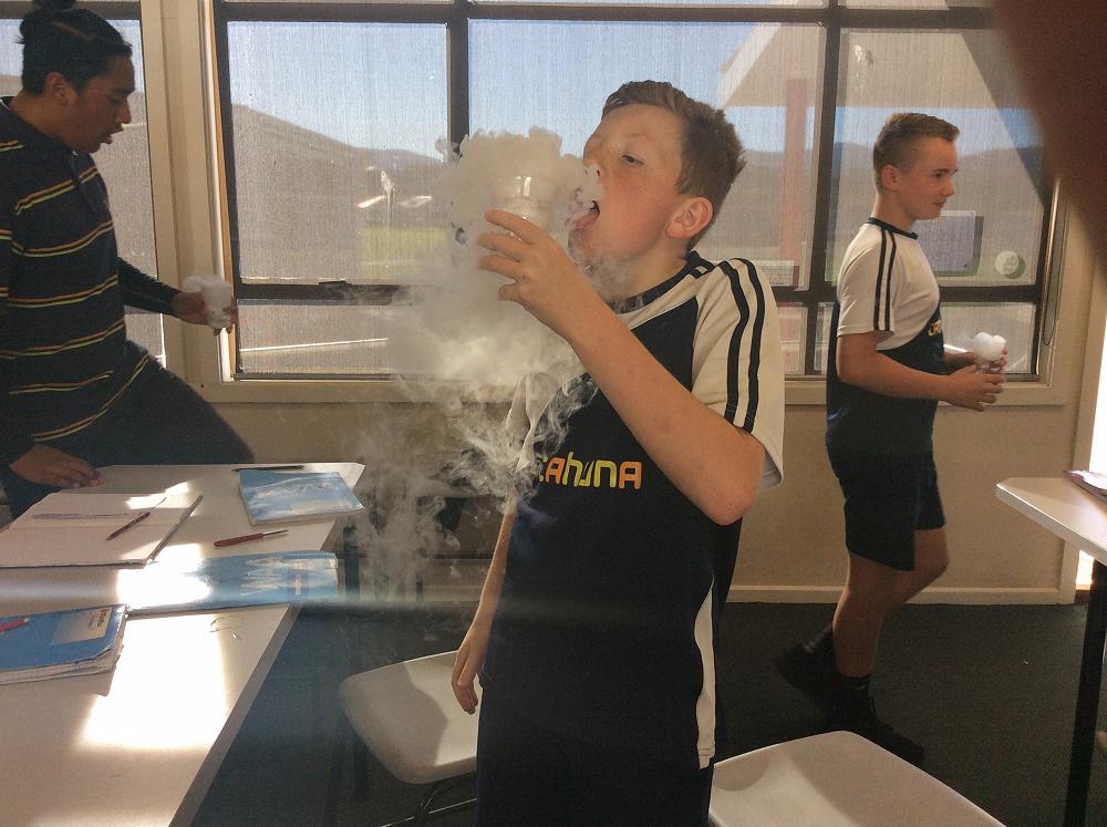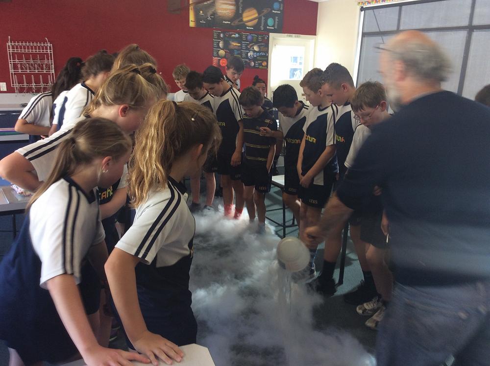On Wednesday 11th of May, Room 13 were one of the first classes to work with Professor Dave Warren from the University of Otago. We started the session off learning about States of Matter (gas, liquids, solids) and then moved on to some exciting experiences. We got to hold dry ice and put it in water to see the reaction (some people gave it a taste test!). Then Mr Warren showed us liquid nitrogen. He threw it on the ground so we could walk through it and showed us how it could shrink a balloon without popping it.