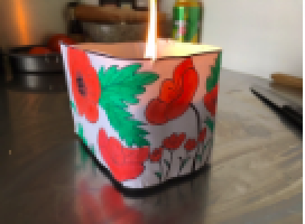 Use a milk bottle to cut the top off. Decorate with images of remembrance. Fill halfway with stones or sand and put a candle in it, if you have one.