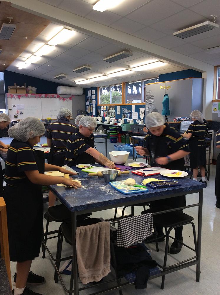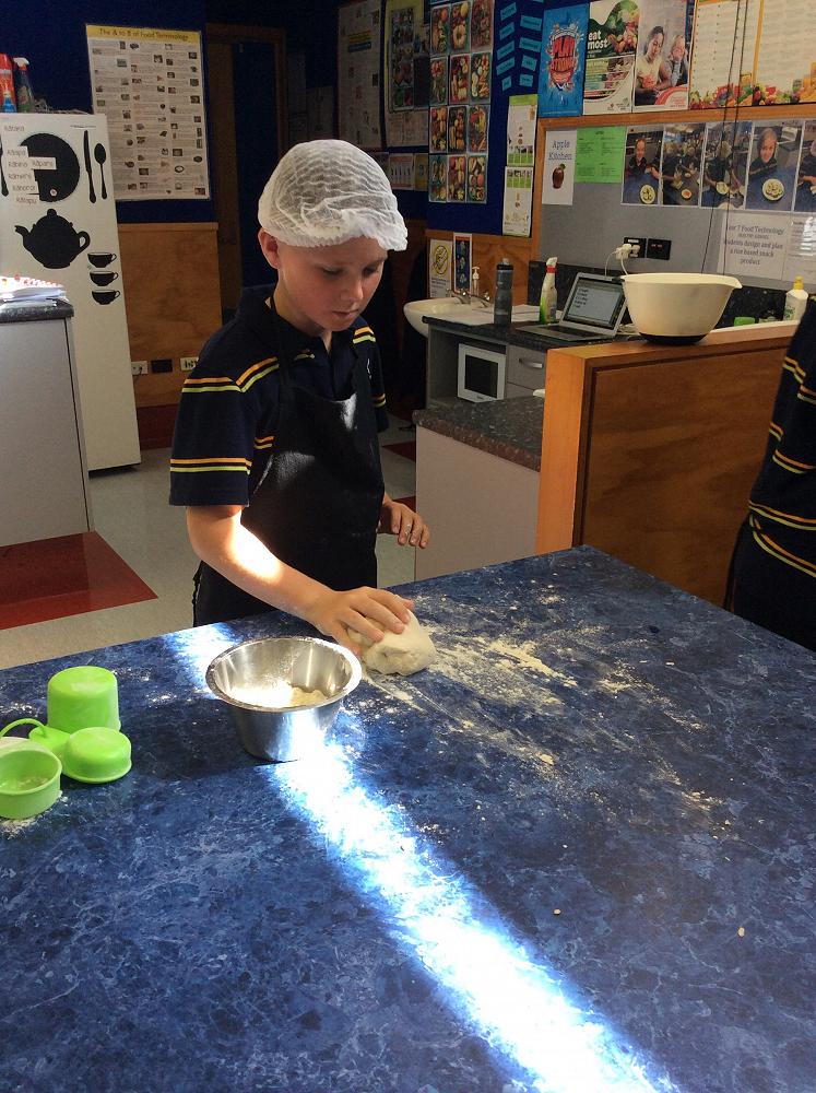 Year 7 Food Technology students work co-operatively in their kitchen groups to create pizza dough and perfect the art of kneading.