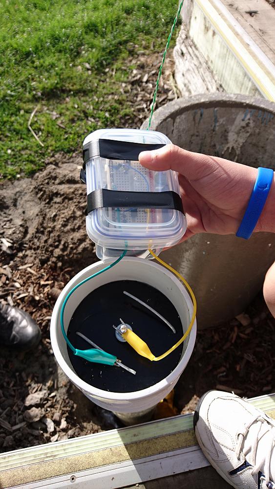 There's still one little problem is that the temperature inside the pipes was still, so a little change could cause rain on the broadboard. We have temporarily slowed down the issue by putting the PICAXE in a well-sealed box, and putting wood blocks on top of the box. But that would not solve the problem completely. We have a solution ready to implement. That would be the Tahuna Ground Water Monitor Version 2.0!