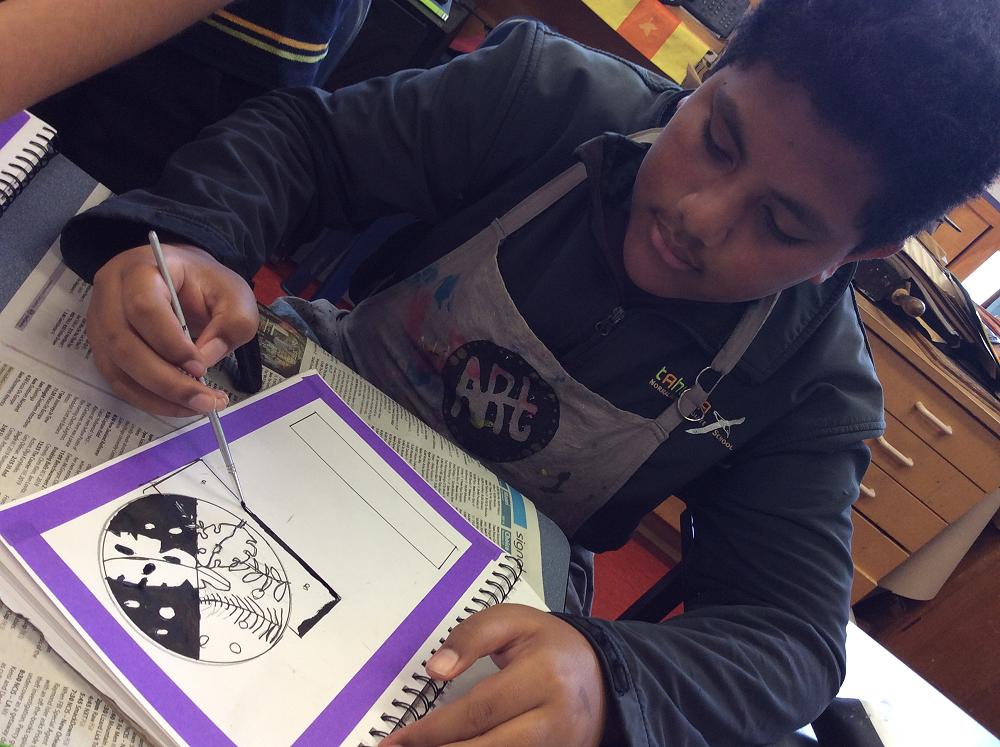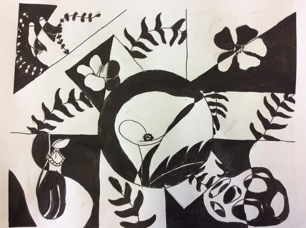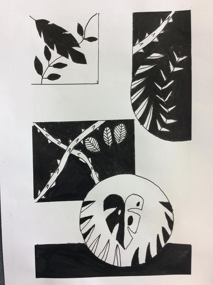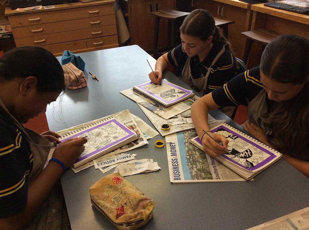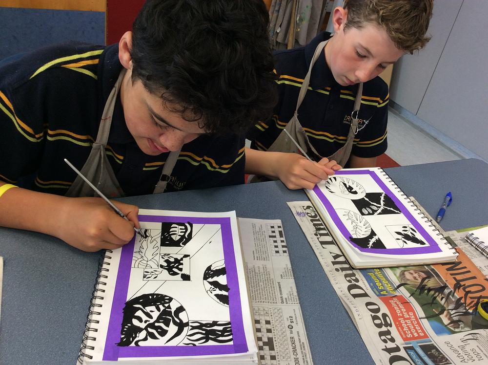 In Visual Art the Year 7 students are showing their understanding of the Elements of Art by highlighting the Positive and Negative Space within their work, using fine motor skills with black pens and a fine tip brush. Enjoy looking at the students working and at their artwork.