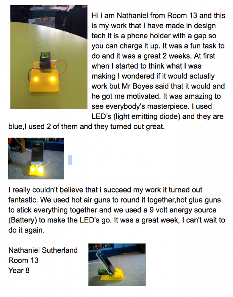 Hi i am Nathaniel from Room 13 and this is my work that I have made in design tech it is a phone holder with a gap so you can charge it up. It was a fun task to do and it was a great 2 weeks. At first when I started to think what I was making I wondered if it would actually work but Mr Boyes said that it would and he got me motivated. It was amazing to see everybody's masterpiece. I used LED’s (light emitting diode) and they are blue,I used 2 of them and they turned out great.