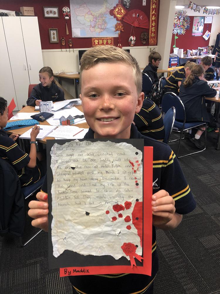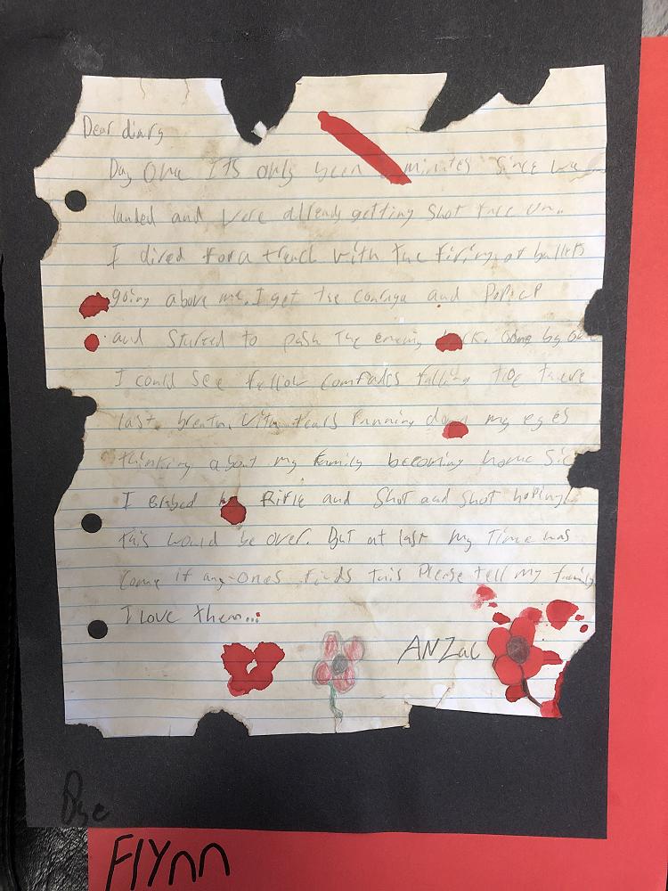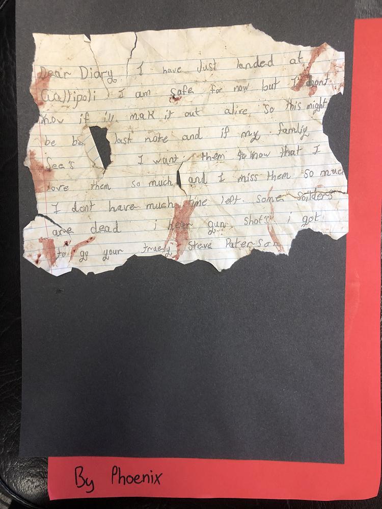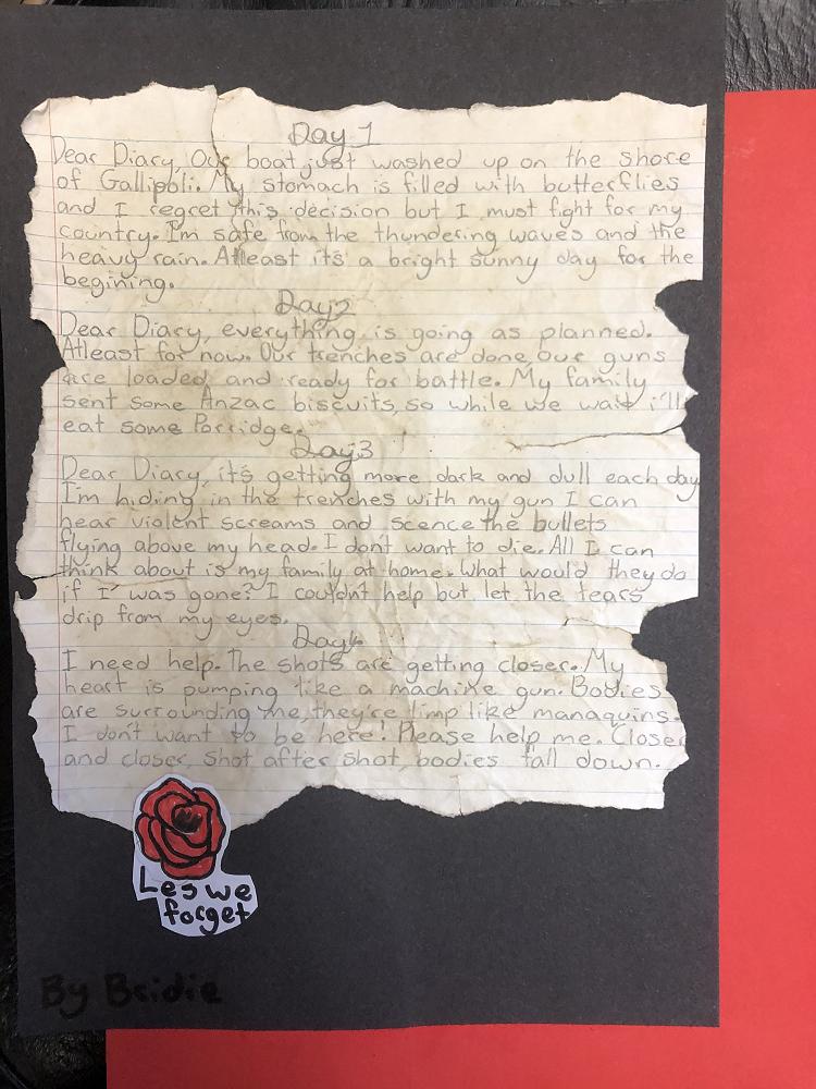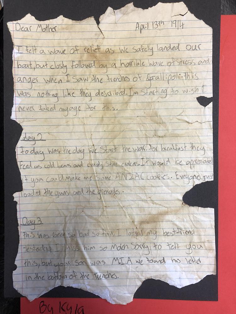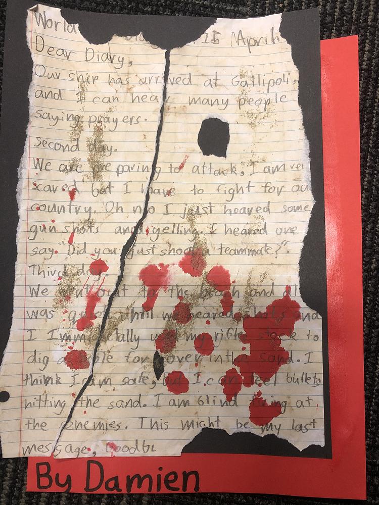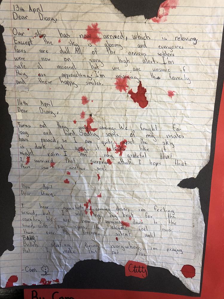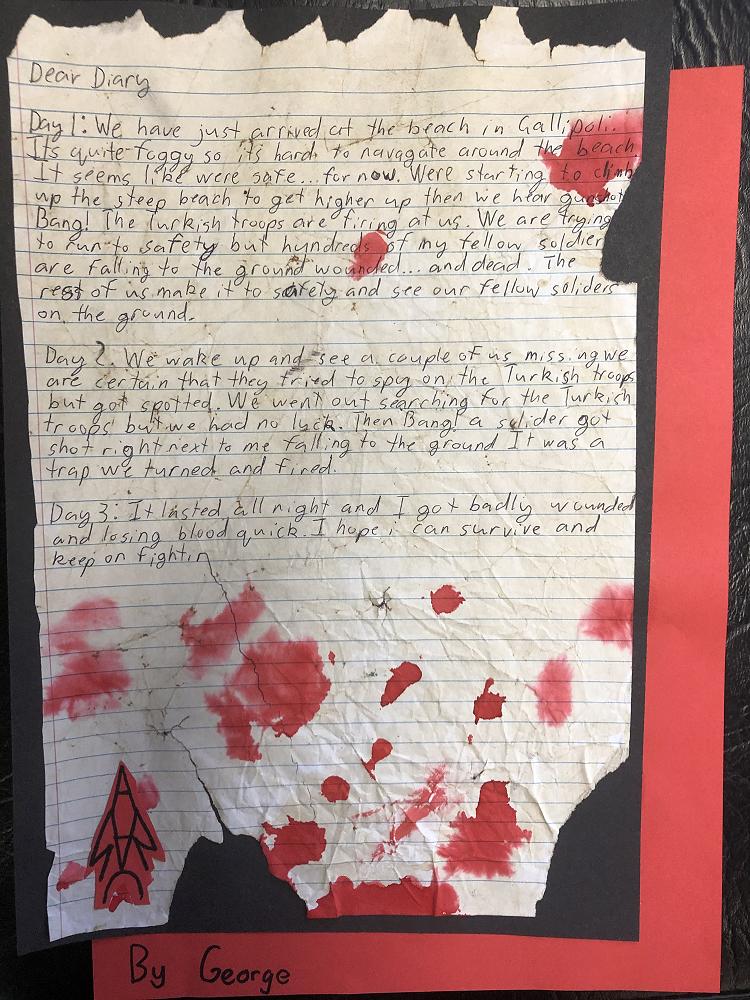 Day One: The boat just landed at Gallipoli. I am felling quite homesick. But after many hours of vomiting and working we are ready for battle. As we got off the boats and into the trenches I was really nervous, but my father once said “fear is a powerful thing don’t let it take control of you”. That gave me courage. My father was a wise but old man.