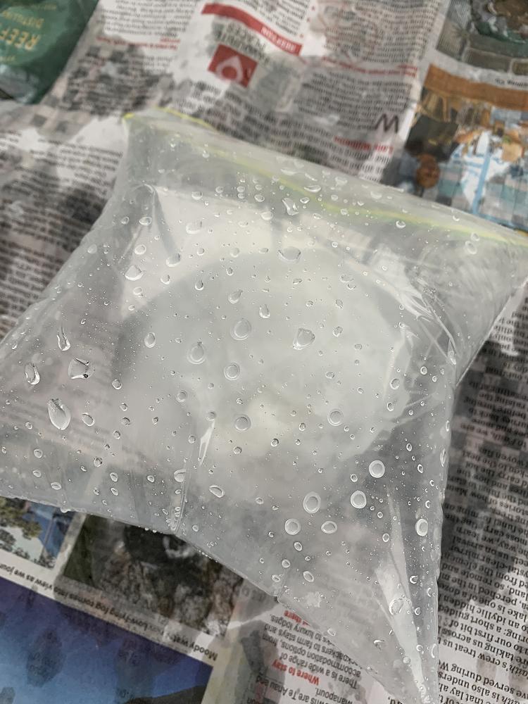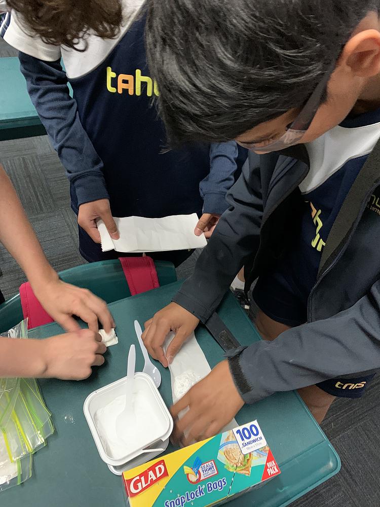 In this experiment, we mixed 60ml of warm water and vinegar in a snap lock back. We then wrapped a teaspoon of baking soda in tissue. The next step, was to put the baking soda in the bag of vinegar...