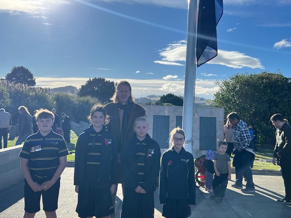 A little later in the morning, a smaller group attended the Anderson's Bay Posy Laying Ceremony. Here, Riley McCracken and Chloe Lyons read the Ode in te reo māori and english repectively before Noema Sirguey lay a wreath on behalf of Tahuna.