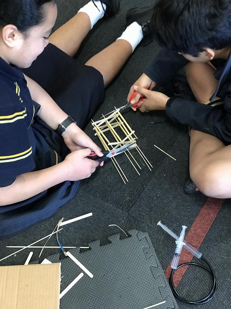 Assembling the lift was not easy. It was a very delicate and niggly job because of the tricky design. I thought drilling the popsicle sticks was one of the hardest parts and the kebab sticks as they could split easily if you pushed too hard (as we experimented). One by one we joined the popsicle sticks and kebabs together to create diamond shapes, so they could move up and down when the bottom stick was moved. Water is put into the syringes and the piece of hose so when you press one end of the syringe, the water travels through the hose and makes the plunger in the other end push the kebab stick forward to make the lift go up! YAY!