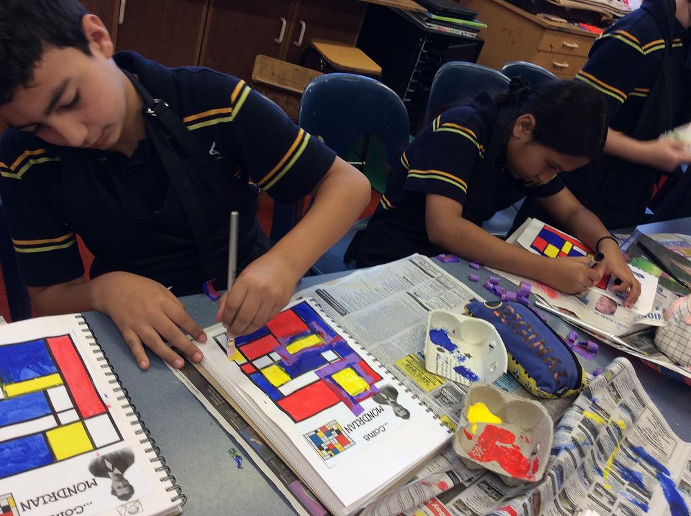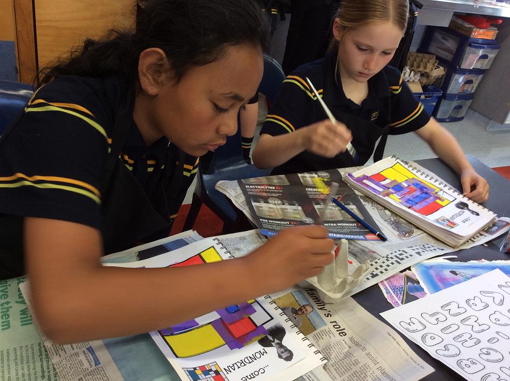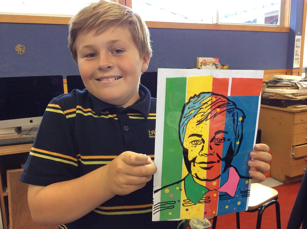 Images within art work sharing connections, reflecting Tahuna, whānau family, maunga which is a mountain & Awa , or Moana, a body of water that is special to them or one that they have lived by. Self portraits are about taking a look at themselves and having fun with colour. Year 7 students are looking at the style of the artist Piet Mondrian. Also having fun with a splash of colour going into Tiki Art. Enjoy looking at these great photos!