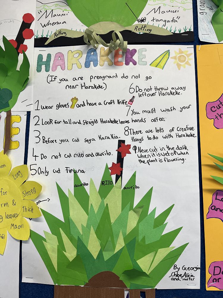 This term for sustainability Rm 5 has been learning about harakeke. We made some posters with the rules and instructions about harvesting harakeke.