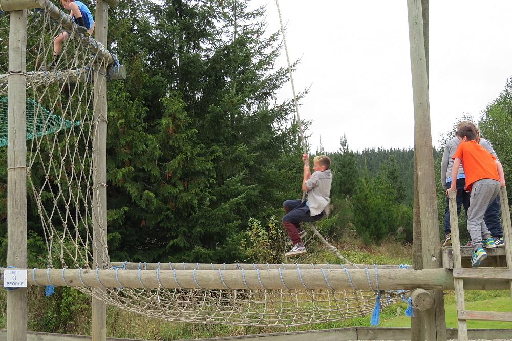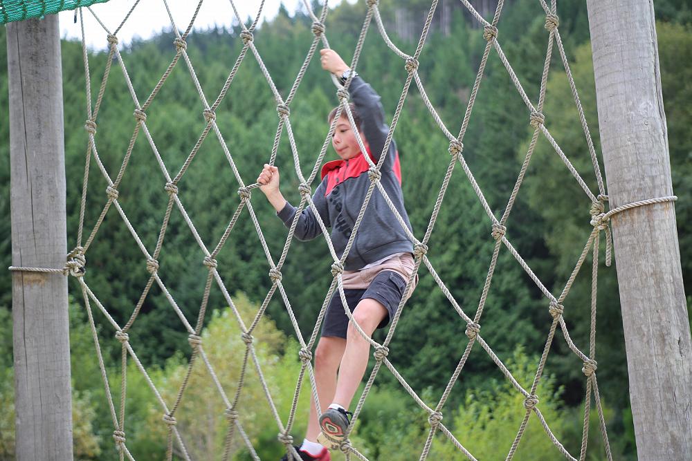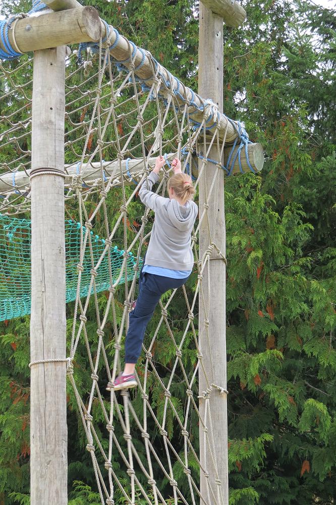 As I make my way to the confidence course I gaze upon the mighty Cargo net swing. As I mount onto the rope I just go with it. As my arms cling on I let go and swing onto the rope net.
