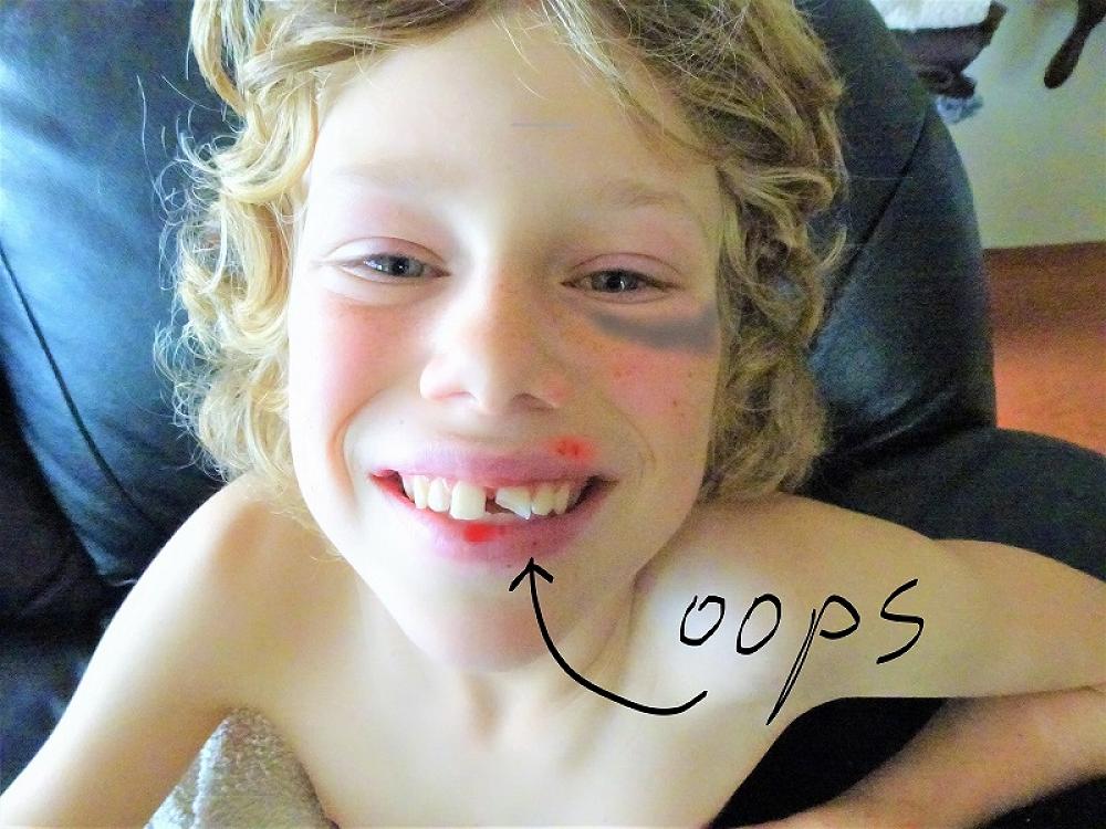 “He has broken his front tooth and has a wicked black eye”
