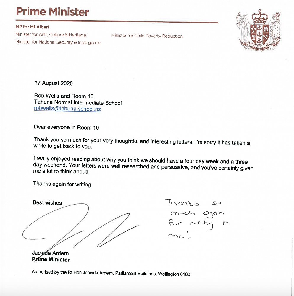 The class thought the best person to write a letter to would be our Prime Minister, Jacinda Ardern, asking for a four day week and 3 day weekend. We looked up whether or not you could actually write a letter to our Prime Minster and we found that it was quite easy to do so. We did realise that being the leader of a country is a pretty busy job and we might not get a response quick or at all. However several letters were chosen to email through Ms Ardern. The letters have been attached below. I have also attached the official response from our Prime Minister!!!!!!