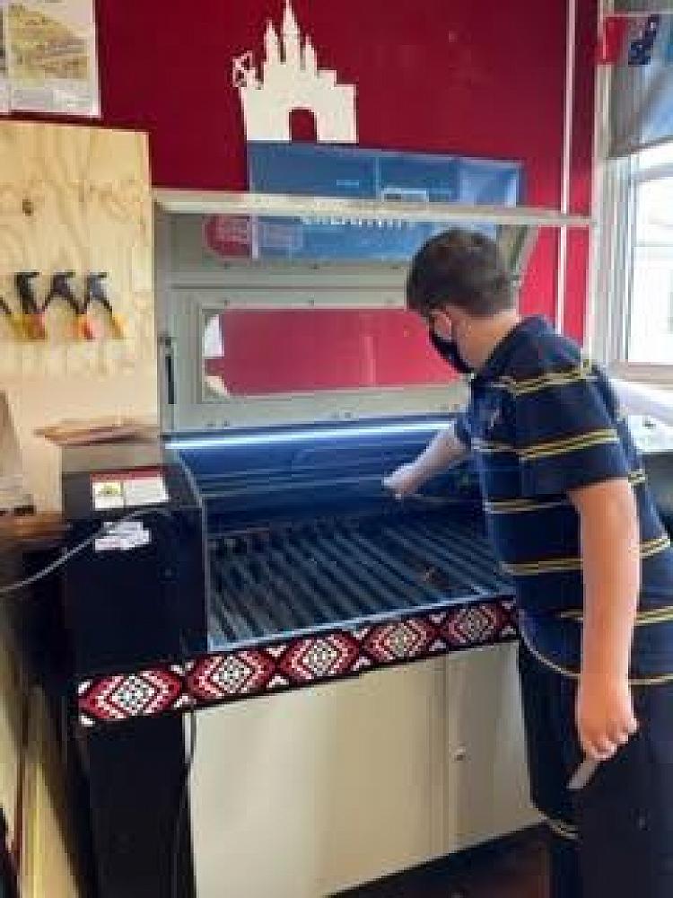 In design tech we made a key ring and drew self portraits to decorate the tech window. We got to see the laser cutter in action as it made our key rings.