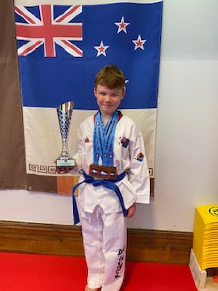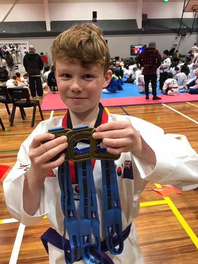 On the 14th of August McKenzie Bryce travelled to Christchurch to compete in the Hyeon Mu New Zealand Open 2021 which is a Taekwondo tournament. McKenzie was awarded 1 bronze medal, 3 gold medals and a trophy for Best Individual Junior in Poomsae. Here is an article written by McKenzie describing his experience and his achievements during that weekend.