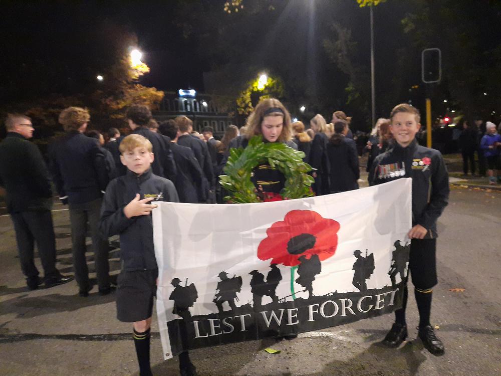 At 6am on the 25th of April, Josh Crowley, Grace Gemmell, and Rupert Lublow-Catty met at Queen's Gardens to join the ANZAC parade to the cenotaph for the Dawn service. Carrying the wreath and flag, they marched with pride and stood firm throughout the service, in very chilly conditions. When about to take a photo, several ex Tahuna students also attending, came over to chat with the trio.