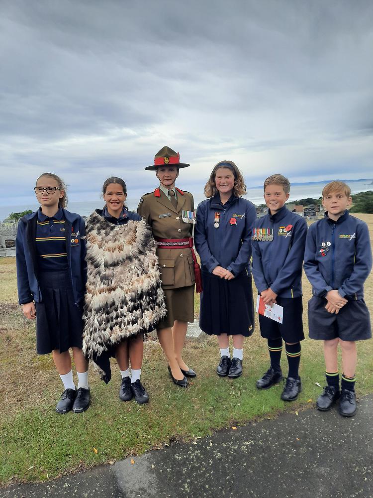 At 9am, Ariana McGinty and Renee Geddes joined us for the posy laying service at Andy Bay. Colonel Kate Lee, who was the keynote speaker at the Dawn Service, also spoke with our group, having recognised the school emblem and being an ex Tahuna student herself. It was a real honour to chat with her as she has achieved so much and been all over the world in her service with the military.