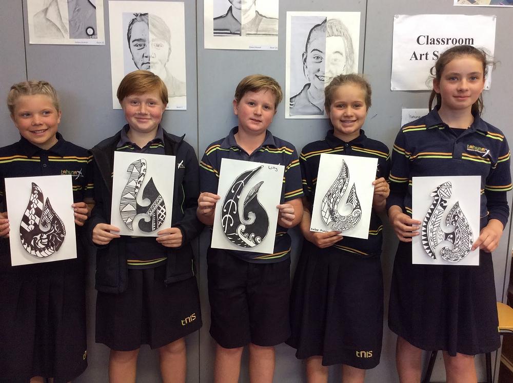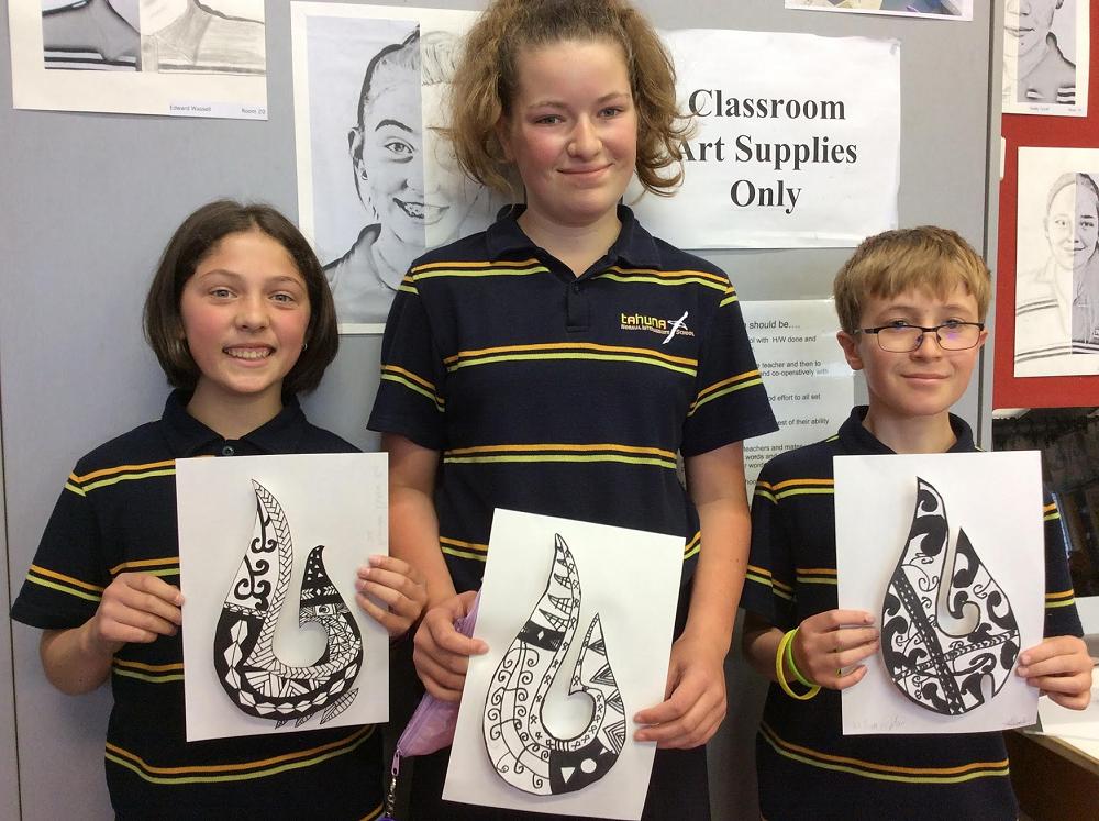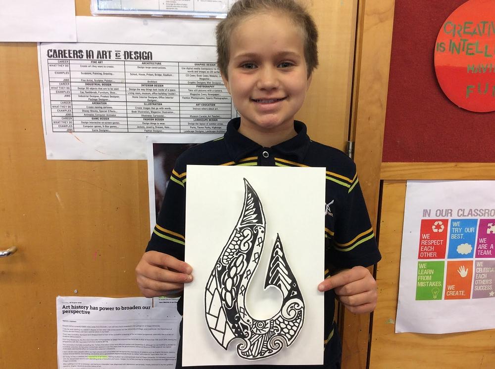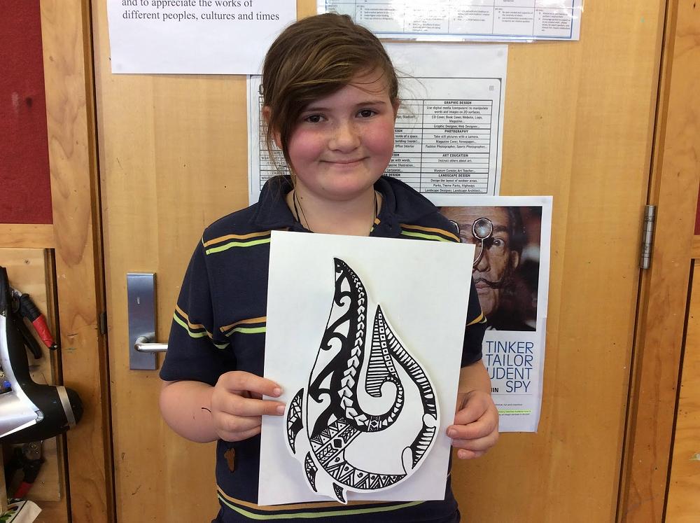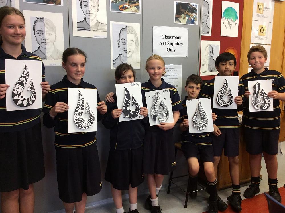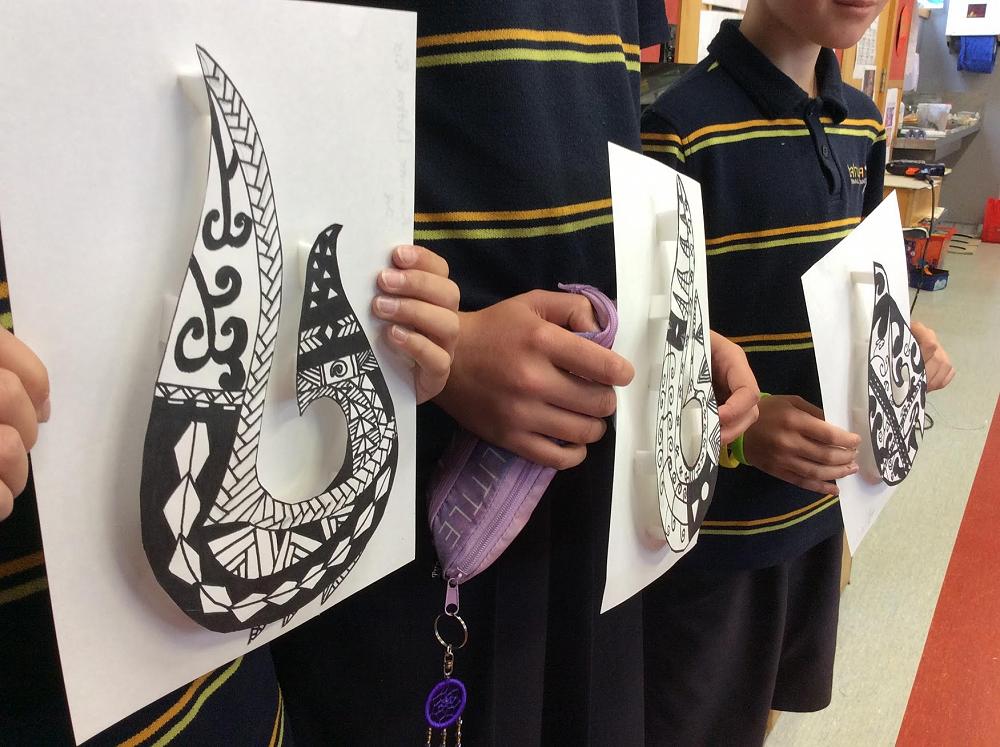 Year 7 Pupils designed their own 3D paper Pounamu in Visual Art. Pounamu is the Māori word for the NZ jade stone which is found on the West Coast of the South Island of New Zealand and has been used in tools. weapons and jewellery. The symbol of matau (fish hook) is very popular and is said to represent prosperity and safe travel over water.