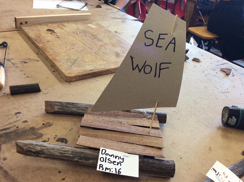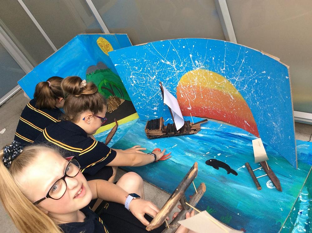 Ocean voyaging was the theme of a joint Hard Materials - Design Technology project. Students built boats modelled on waka hourua (double-hulled waka) made from craddy sticks (the dry stalk of the harakeke, also known as korare). They then made models of Pacific Islands and of Dunedin, with sea in between for the boats to travel. Some children extended the voyaging theme into interstellar travel. Unlike normal tech classes, where students make personal projects to take home, each class built on the work of the one before.