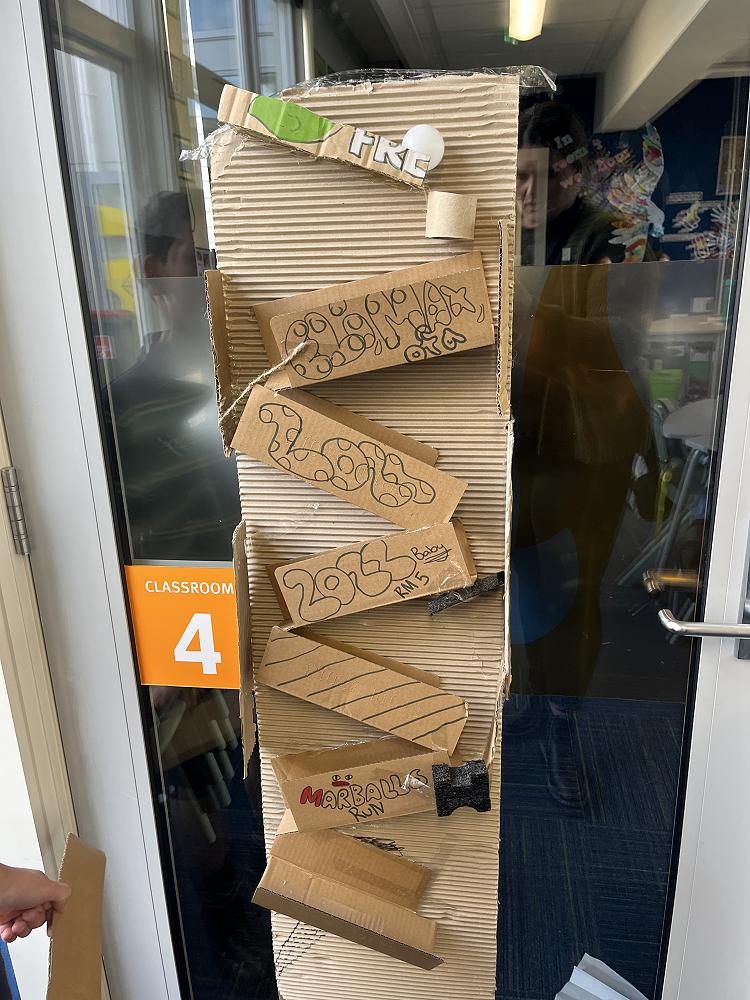 What happened is we cut pieces of cardboard into ramps and other things and then we stuck them onto our long strip of cardboard using tape and hot glue guns. Creating a path for the marbles to run down however some people used ping pong balls meaning they would need bigger ramps so they could fit and roll down the ramps. We also used other materials such as plastic cups, this foamy material and plenty more. For example we would cut holes in the bottom of the cups creating a tunnel for the marble to go down. Some really smart people created elevators using string and cardboard. What would happen is the marble would roll onto it and since The marble is heavy the string would start moving pulling the elevator and marble downwards.