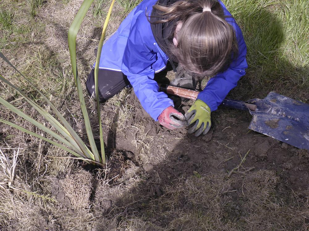 When we arrived, we got out our gloves and shovels and started to plant the native plants we bought. We took lots of photos of the day as you can see. In total, we planted 100 plants over a 1,000 metre square area along the creek, which included native plants such as Harakeke, Kowhai and other plants. We added stakes and shields to protect the plants as they grow.